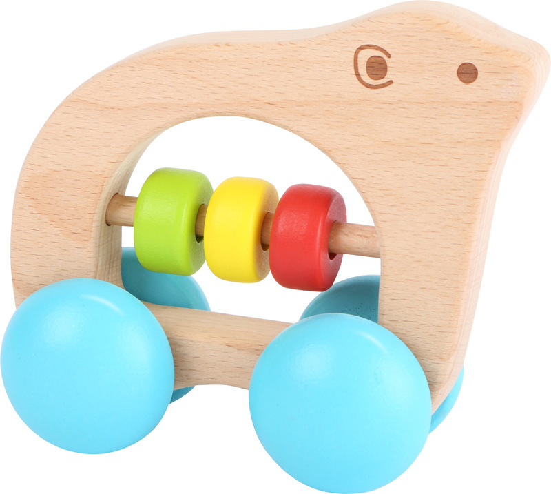 What's rattling around in that bear's belly? This exciting rattle shelters three wooden rings that can be shaken. The ergonomic shape allows the rattle to fit well in the hand and can be rolled over the floor. This rattle has two functions: the wooden rings bounce around crazily to make noise, and it also rolls smoothly across the gorund! A great wooden toy with a high fun factor!