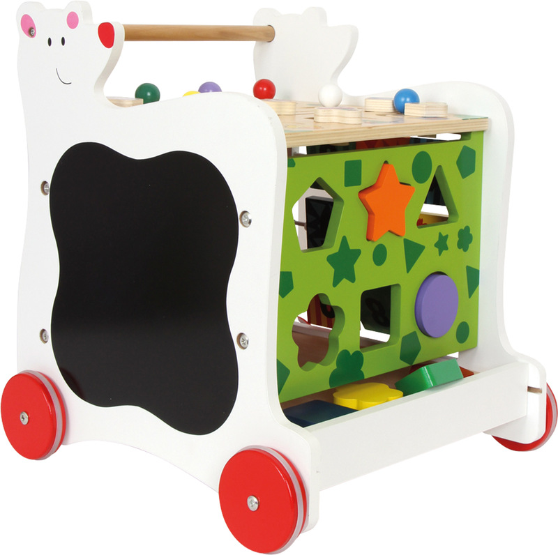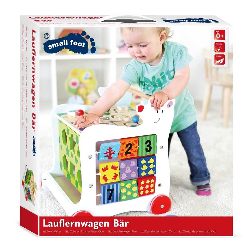 On the go with the little bear! This bear in the form of a versatile baby walker is ready to accompany children when they are learning to walk and discover the world. This multifunctional walking trainer also teaches time and brings lots of fun in the form of inserting, pushing, and spinning various wooden elements. The internal storage space as well as the rubber-finished wheels make this baby walker a practical playtime companion.