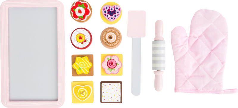 No one can resist! These colourful wooden biscuits are presented on a baking tray that can be removed from the oven of the children's play kitchen with the oven mitt. The movable rolling pin and the wooden dough scraper complete this beautiful play set made of FSC? 100%-certified wood. Which cookies has the prettiest decoration?