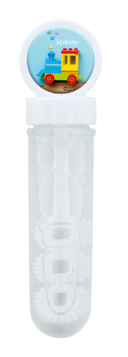 Bubble blower in coloured plastic. With 30 ml bubble liquid.