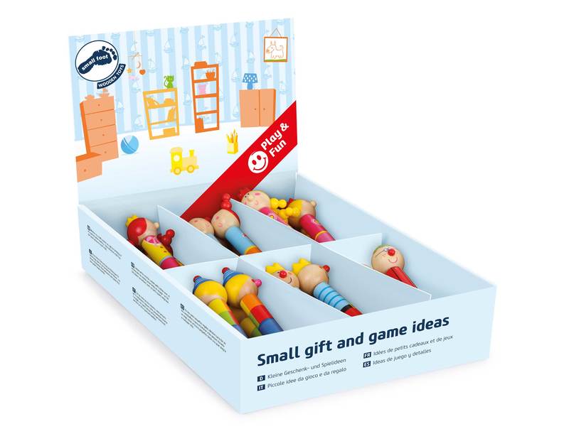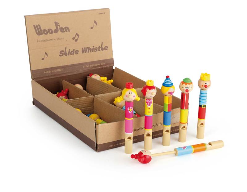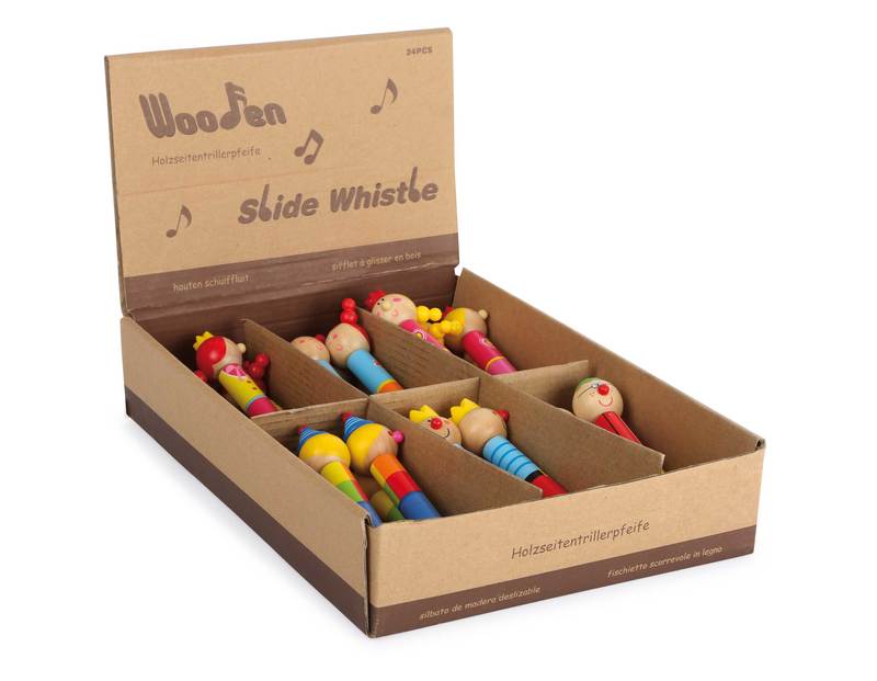 Set of 24. These charming clowns are real musical instruments! With a kid-friendly design and lovingly painted, these wooden flutes look especially cute. Pulling the knob on the end changes the tone. When set up in the display on the sales counter, these flutes will enchant both young and old, and are a guaranteed last-minute purchase! Who can hit the right notes first?