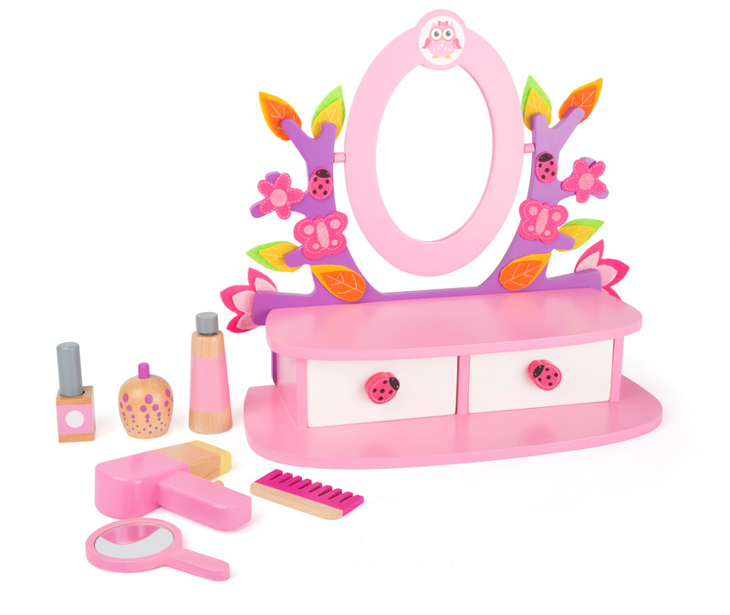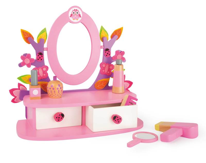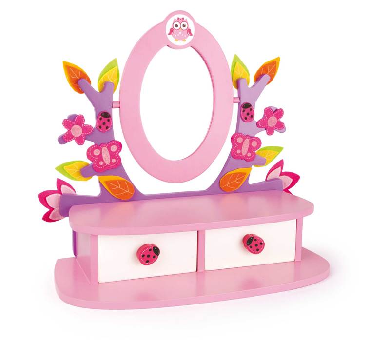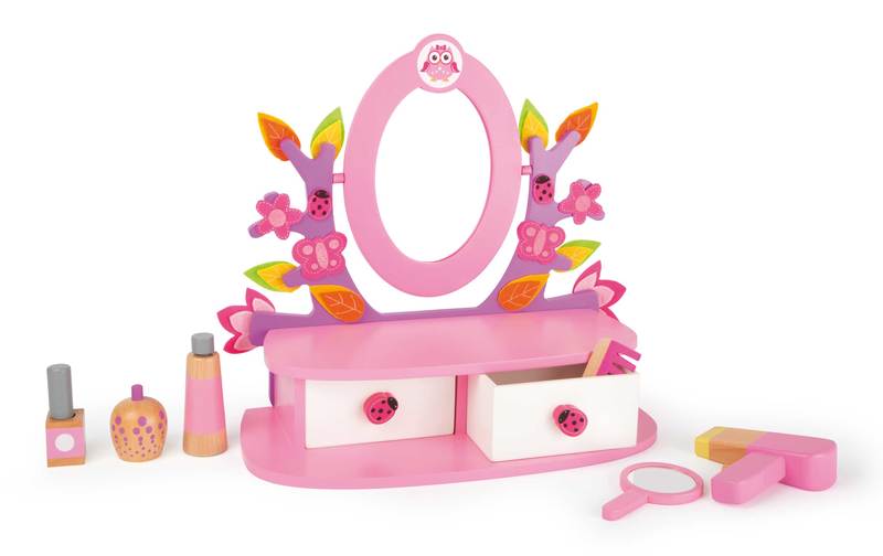 Who is the most beautiful of all in the children?s room? This lovingly-designed wooden make-up table with felt applicators and many accessories is the ideal companion for the first beauty pageants. In addition to a hairdryer with a usable on-and-off button, there?s a comb, a hand mirror, a perfume bottle, nail polish and a shampoo bottle with a removable cap that all provide long-lasting playtime fun. The real mirror completes the experience. All accessories can be safely stored in two drawers. The mix of materials, with wooden leaves, petals, and ladybugs made of felt really make this beauty salon particularly happy and playful. For little Top Models or for the doll beauty pageant, this Make-Up Table is a real winner!