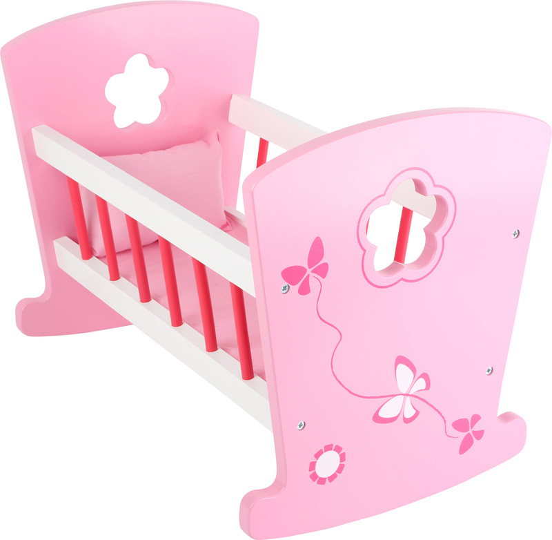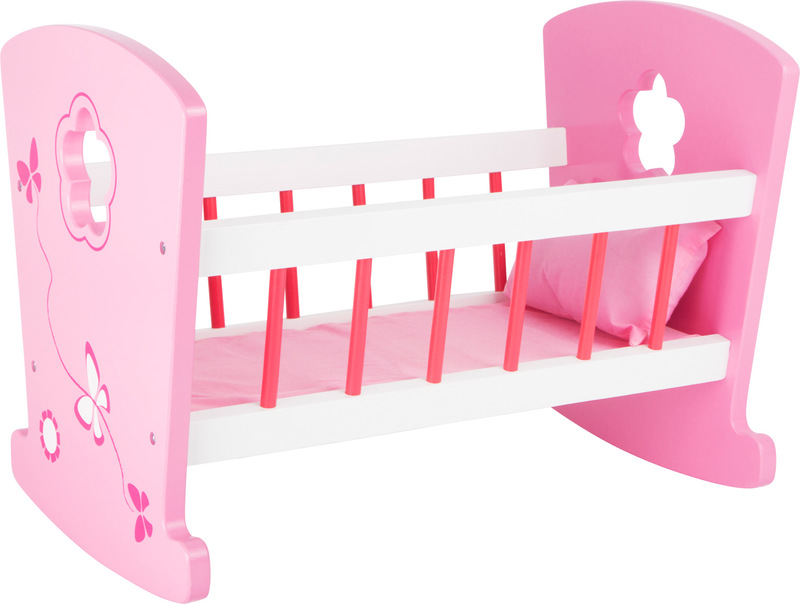 It's time for bed! Dolls and stuffed animals can be rocked gently to sleep in this cute doll cradle made of stable wood. The cradle is lovingly painted and decorated in great detail. Dolls and their friends can make themselves comfortable on the little pillows accompanied by a lullably and calming rocking motions - who wouldn't want to nap here? This doll cradle is a great addition to the children's room, that all doll mamas and papas will love!