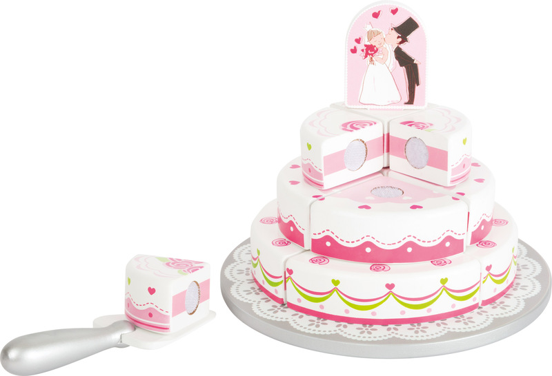 What a glorious exemplar! This three-story wooden wedding cake will dazzle all the wedding guests. Each layer can be divided into four cake pieces held together by Velcro. All the cake pieces can be quickly divided and served elegantly with the convenient cake server. With a suitable wedding decor and a bridal couple to stick on top as a highlight, this wooden cake is a very special eye-catcher. No wonder everyone here only has eyes for the great cake!