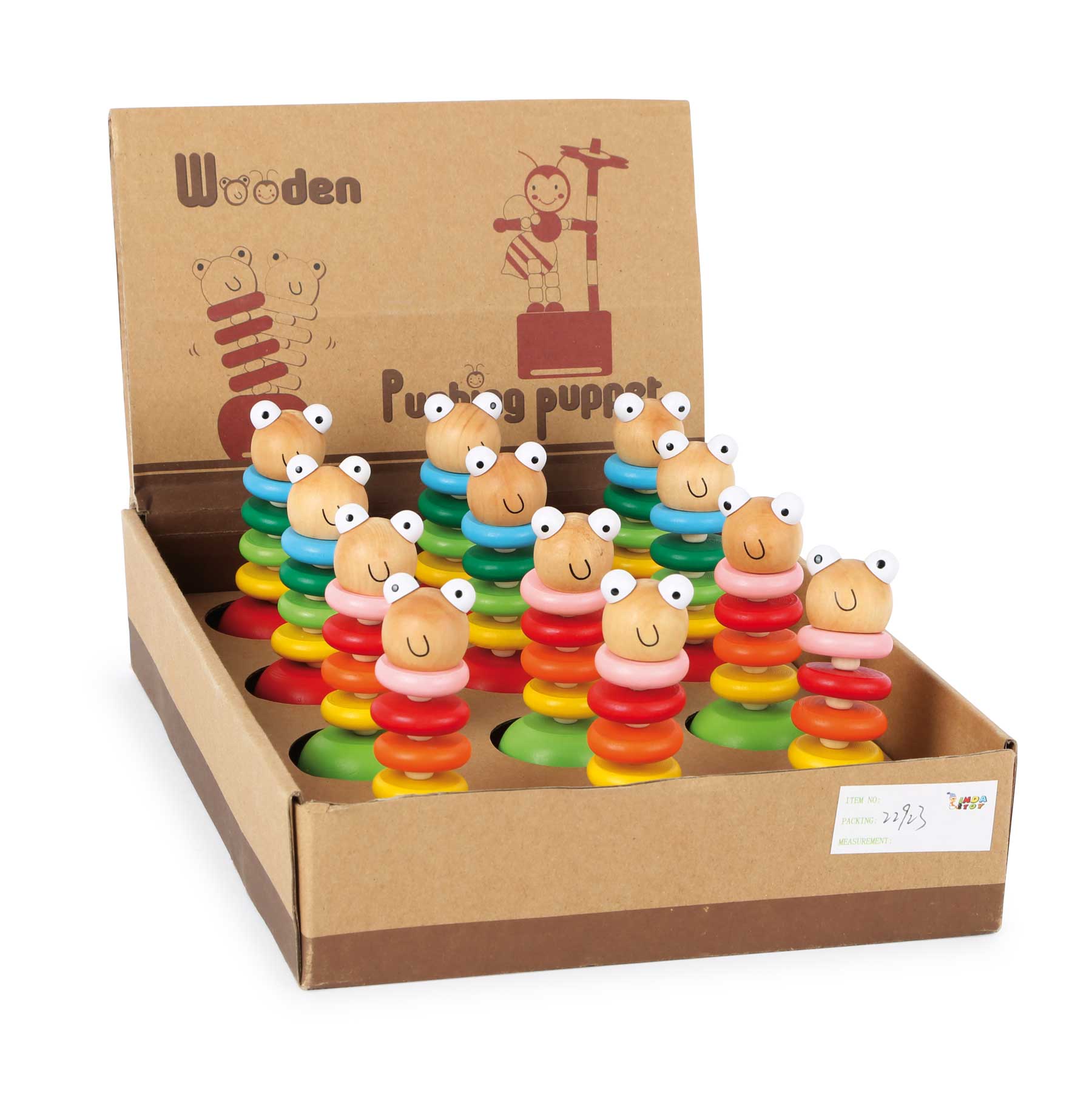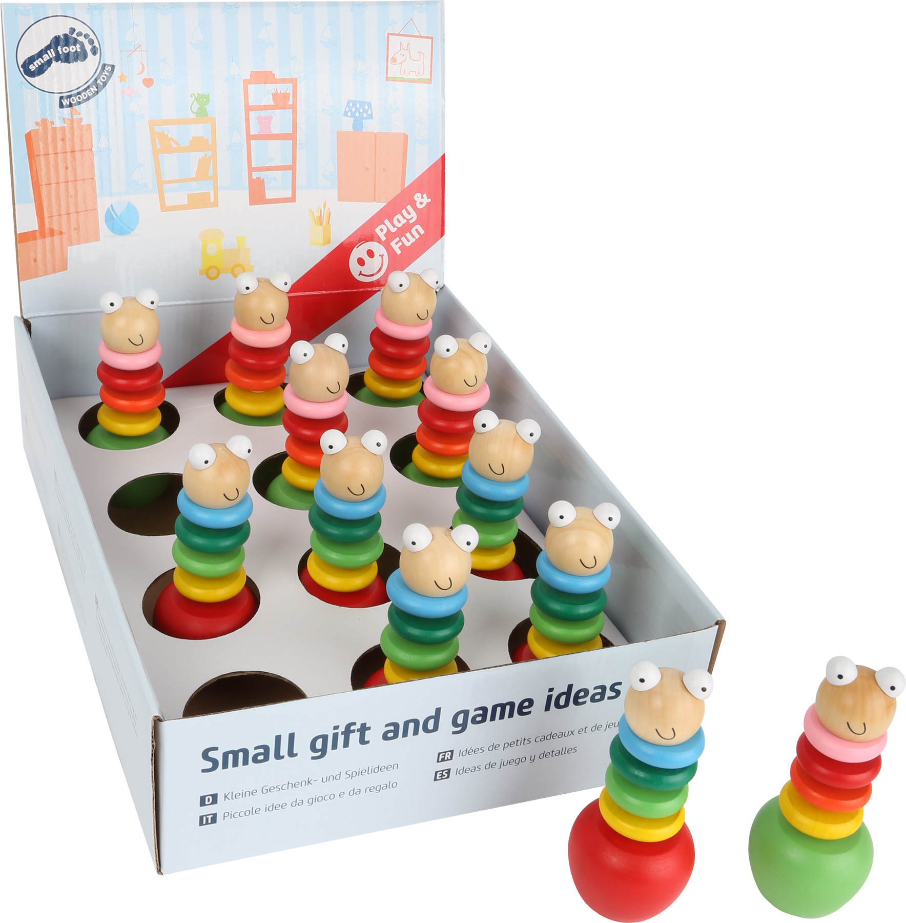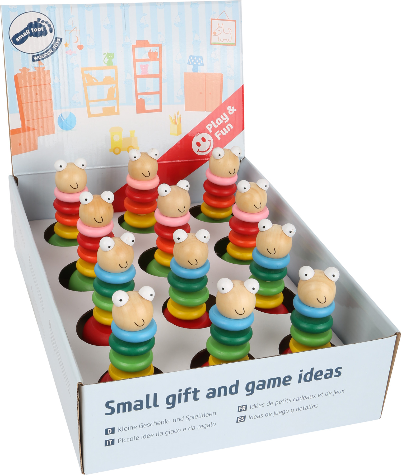 Set of 12. Who's hopping around there? These cute caterpillars wiggle around when the button on the base is pressed. The lovingly painted wooden animals with the colourful rings are real eye-catchers. The big eyes say "Take me with you!" - and are in a practical display for the sales counter and shelves, where they present themselves as a great small gift of entertainment and fun for all ages!