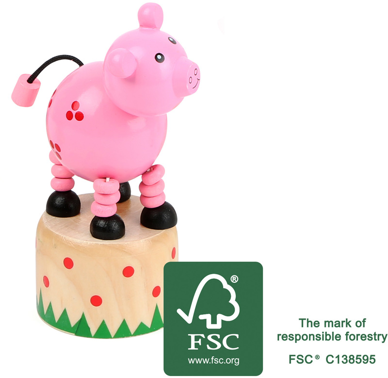 There?s a lot of wiggling going on here! Pressing the bottom of this toy brings this jolly pig to life and creates new, silly movements by applying different pressures to the bottom in different locations. Made of 100% FSC?-certified wood. Lots of wiggling fun!
