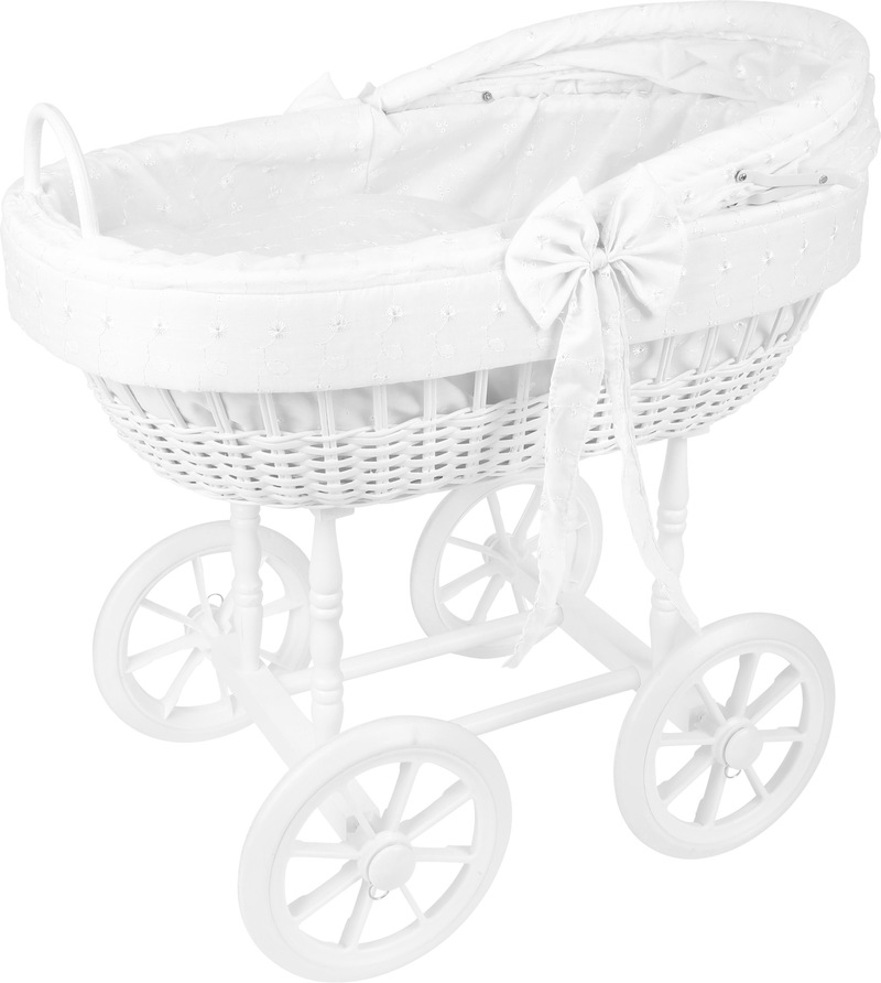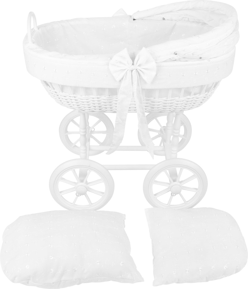 This bassinet drives straight to dreamland. In order for the doll children to be able to fall asleep quietly, it rolls very quietly and gently on rubber-finished wheels across the floor. The canopy can be easily opened and closed by children's hands, and it's a real eye-catcher with its beautifully embroidered fabric. Dolls can really make themselves cozy on the cushioned pillow and under the cuddly blanket! The complete interior of the bassinet is lined with an embroidered cloth and fulfils all wishes. It's the perfect doll toy for the nursery.