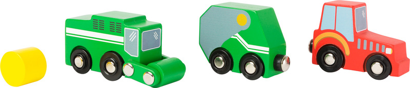 Work is calling! With this four-piece farm set made of painted wood with smooth-rolling plastic wheels from our small foot world playworlds, you can drive the combine harvester over the field. Then you can collect the straw with the tractor and the straw baler attached together with a magnet. A small, round straw bale is also included. This farm set is a great addition to the farm world and to the other products from our small foot world series!