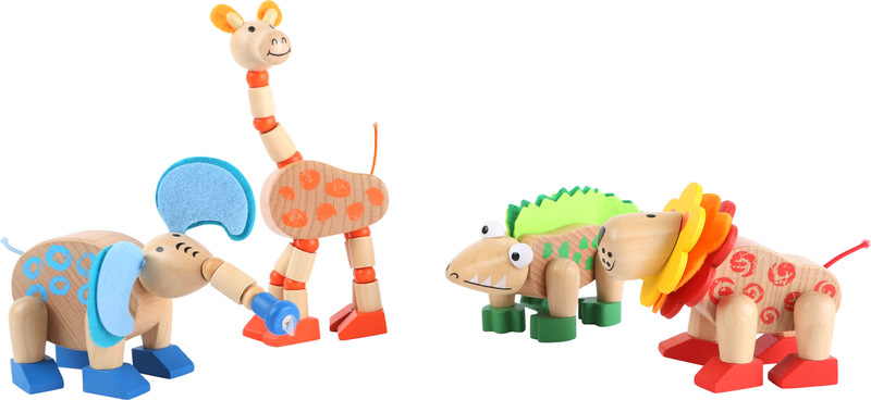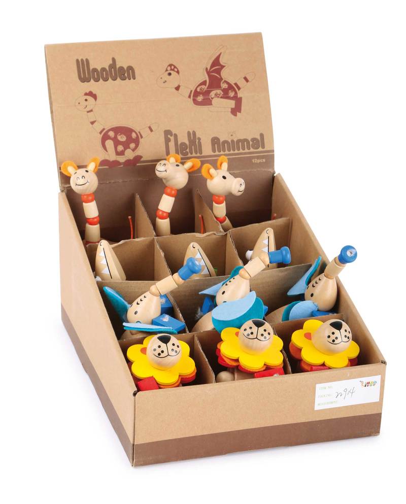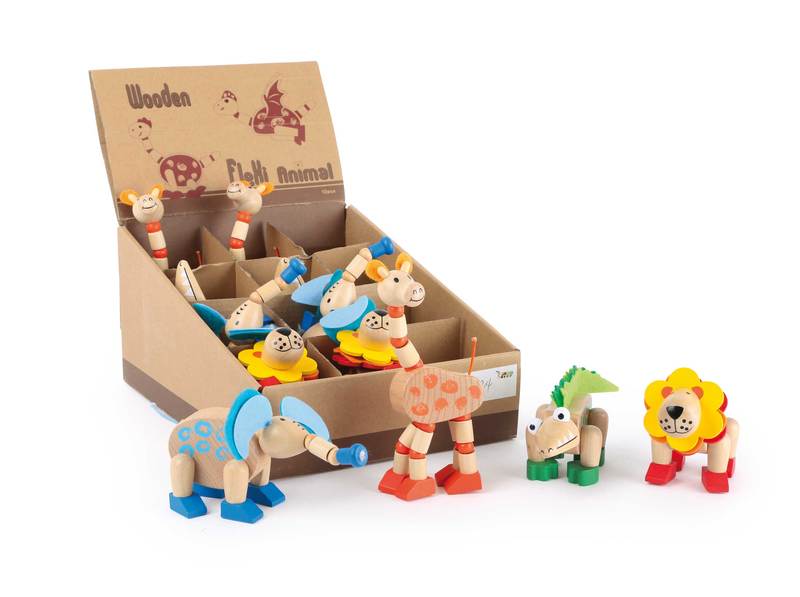 Set of 12. These animals made of smooth, polished, and painted wood can bend their appendages in all sorts of silly ways. The lion, elephant, crocodile, and giraffe are lovingly constructed and have some felt parts, too. Diverse playtime fun is guaranteed with the moving parts! They're great as constant companions and things to occupy the hands while on-the-go, which makes them a great spontaneous gift. In a sales-promoting display, they're sure to lead to on-the-spot sales!