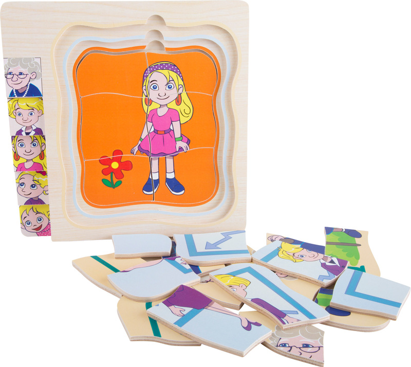 28 pieces. With this super wooden puzzle, consisting of four layers, children can see how we grow and how our appearance changes with the years. The individual puzzle pieces can be matched from baby through to grandma. Faces of different ages are shown on the left and can be used for reference. Puzzle made of FSC? 100%-certified wood. This puzzle trains concentration and motor skills.