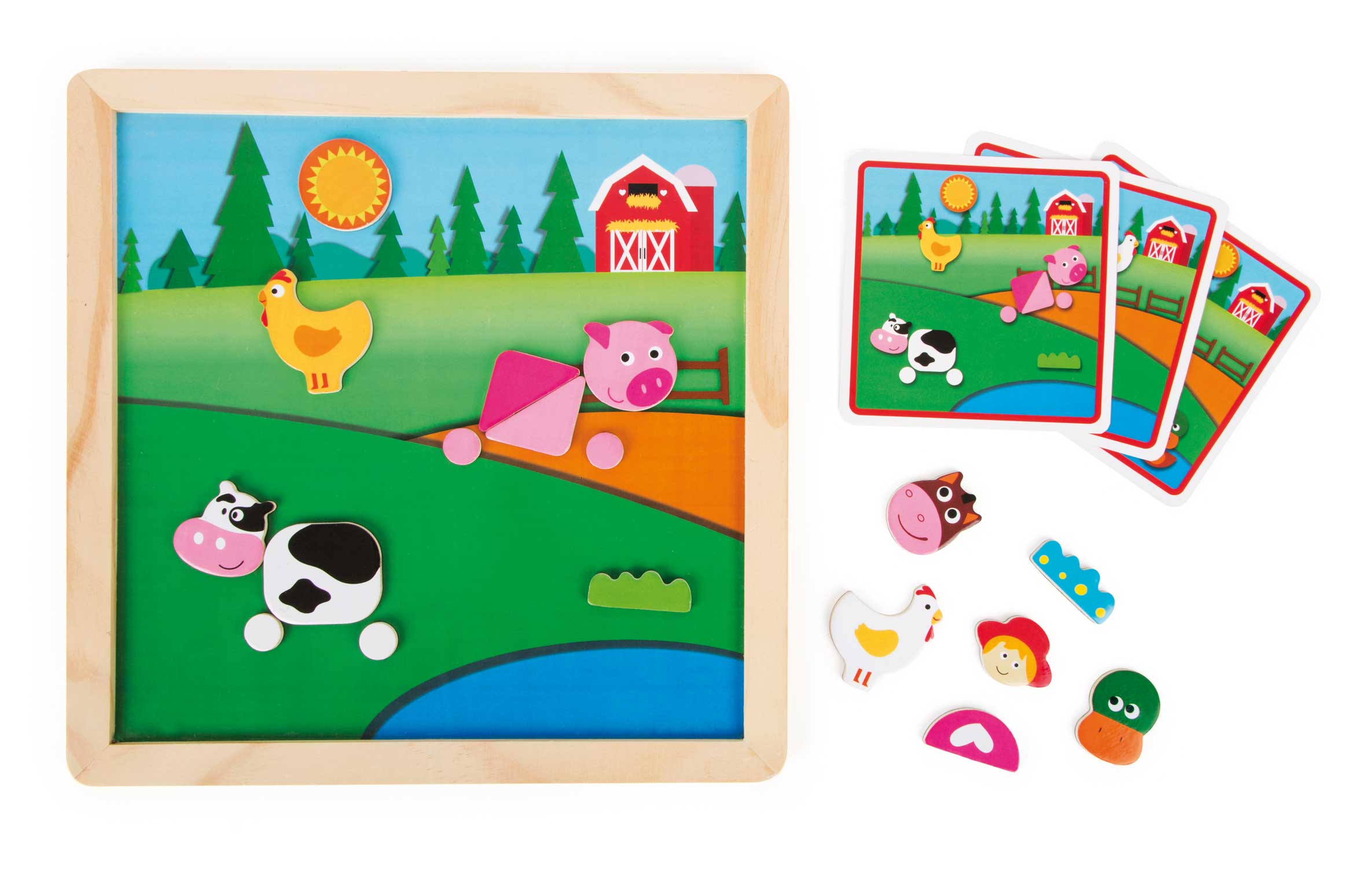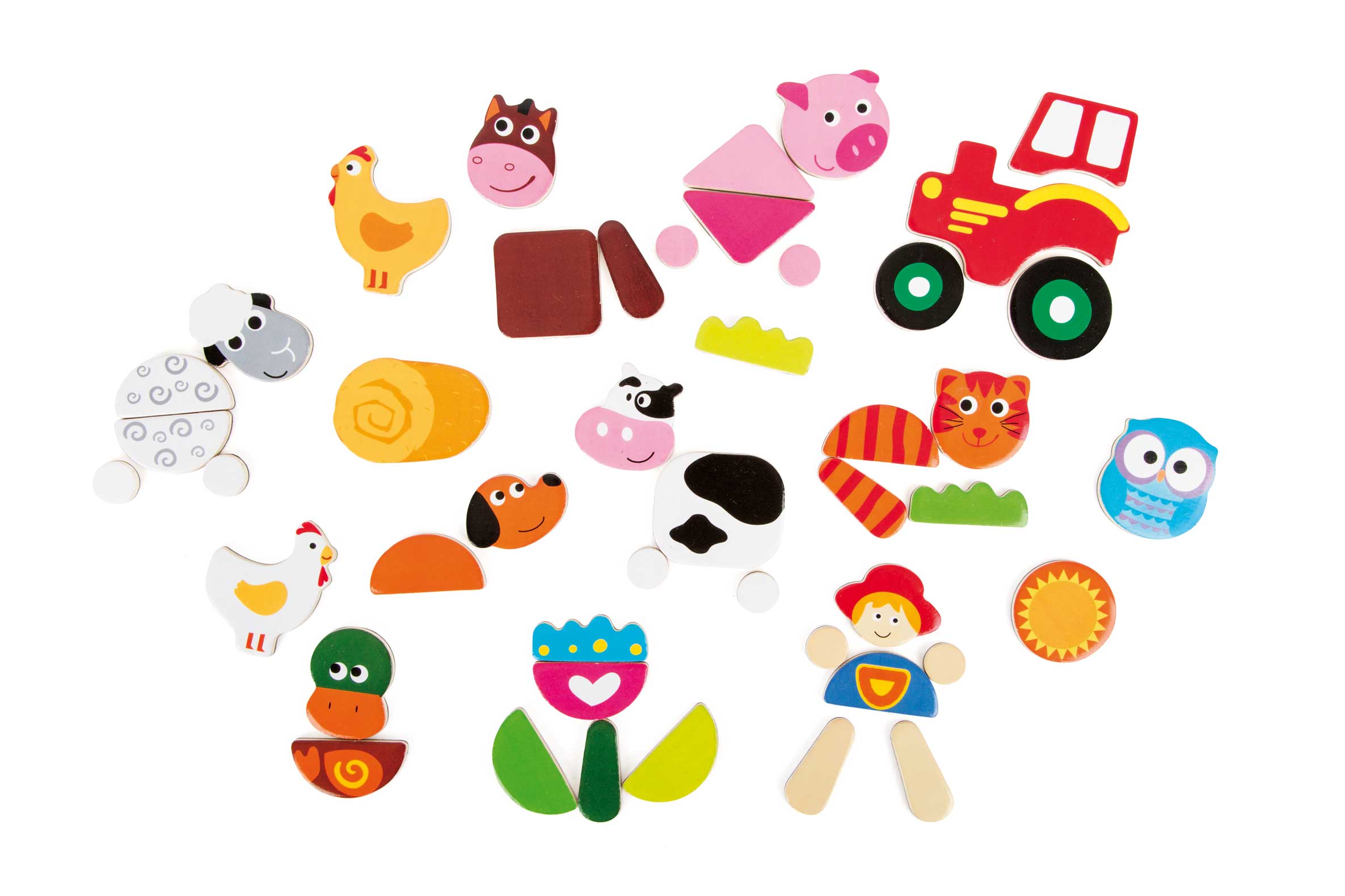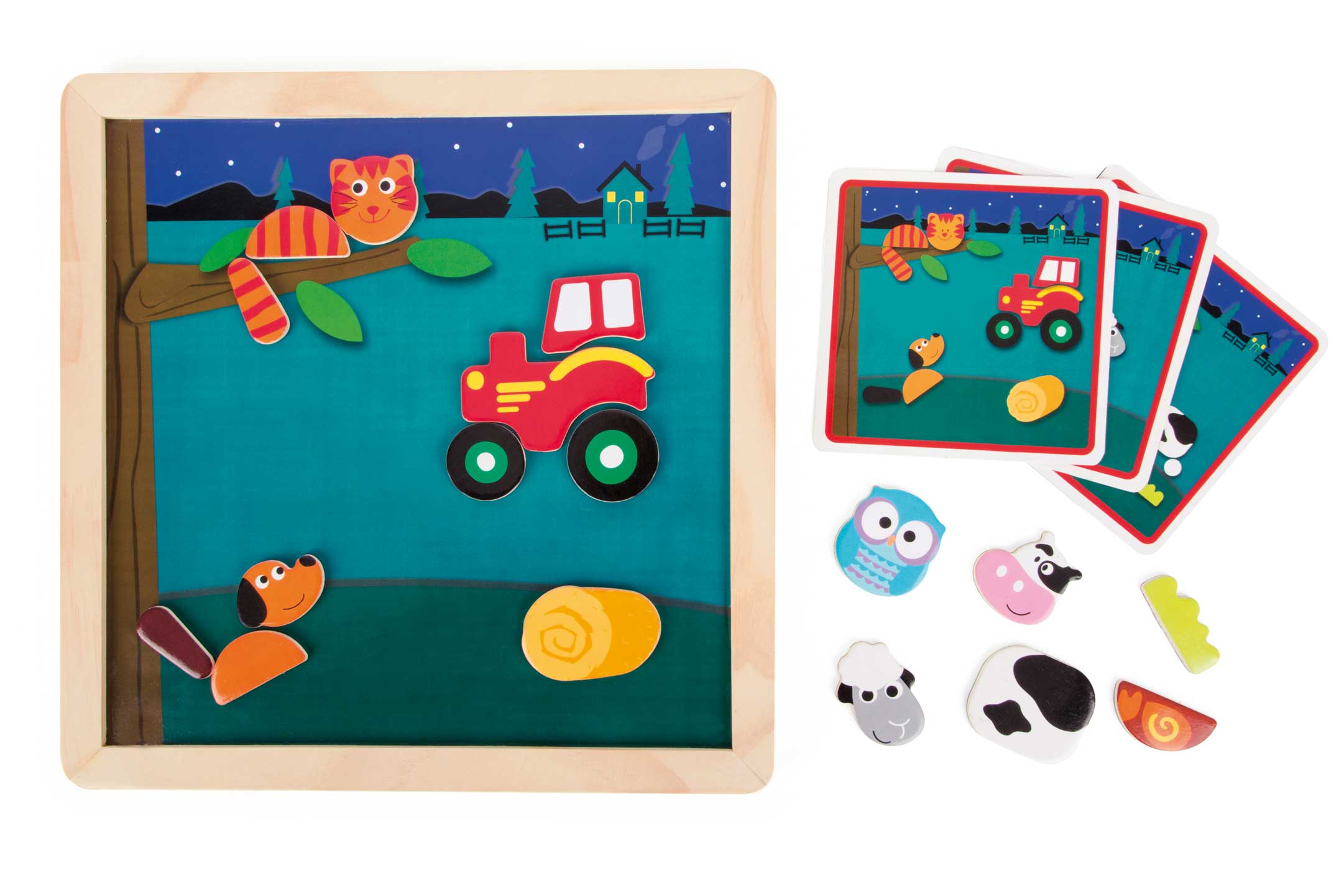 What a wild farm life! This magnet puzzle invites you to build exciting scenes, day and night, with the wonderful pictures shown on 46 magnetic pieces. The magnetic board and the three lovingly drawn cards allow children to experience the stories and encourage them to discover, tell stories, and make animal noises. In addition, fine motor skills are developed. The magnet puzzle is a great toy that's great for both the children's room and for on-the-go!