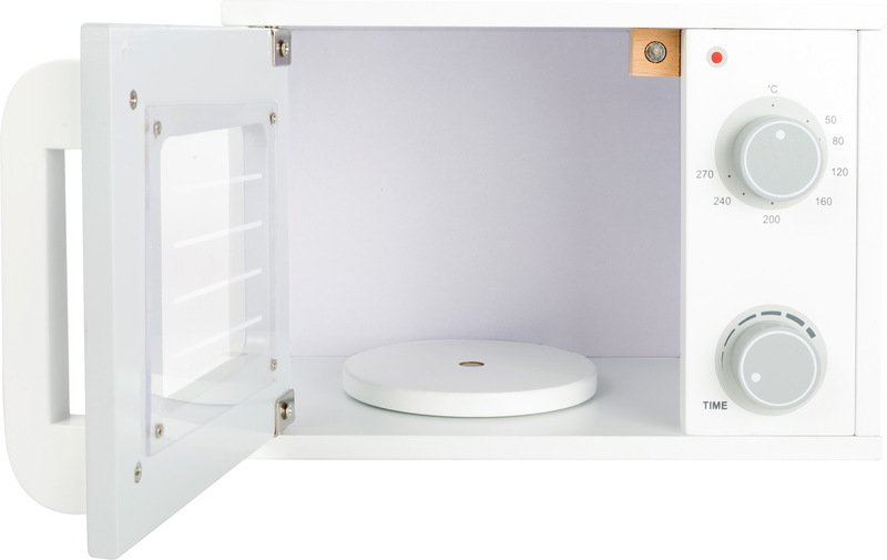 Ding...the food is ready! Kids can pretend to warm up and prepare food in no time with this wooden play microwave. This realistic play opportunity offers a rotating plate and a door that?s held closed by a magnet. The temperature and time functions can be set easily with the rotatable knobs. A practical household appliance that belongs in every modern children?s play kitchen. An ideal addition to all children's play kitchens.
