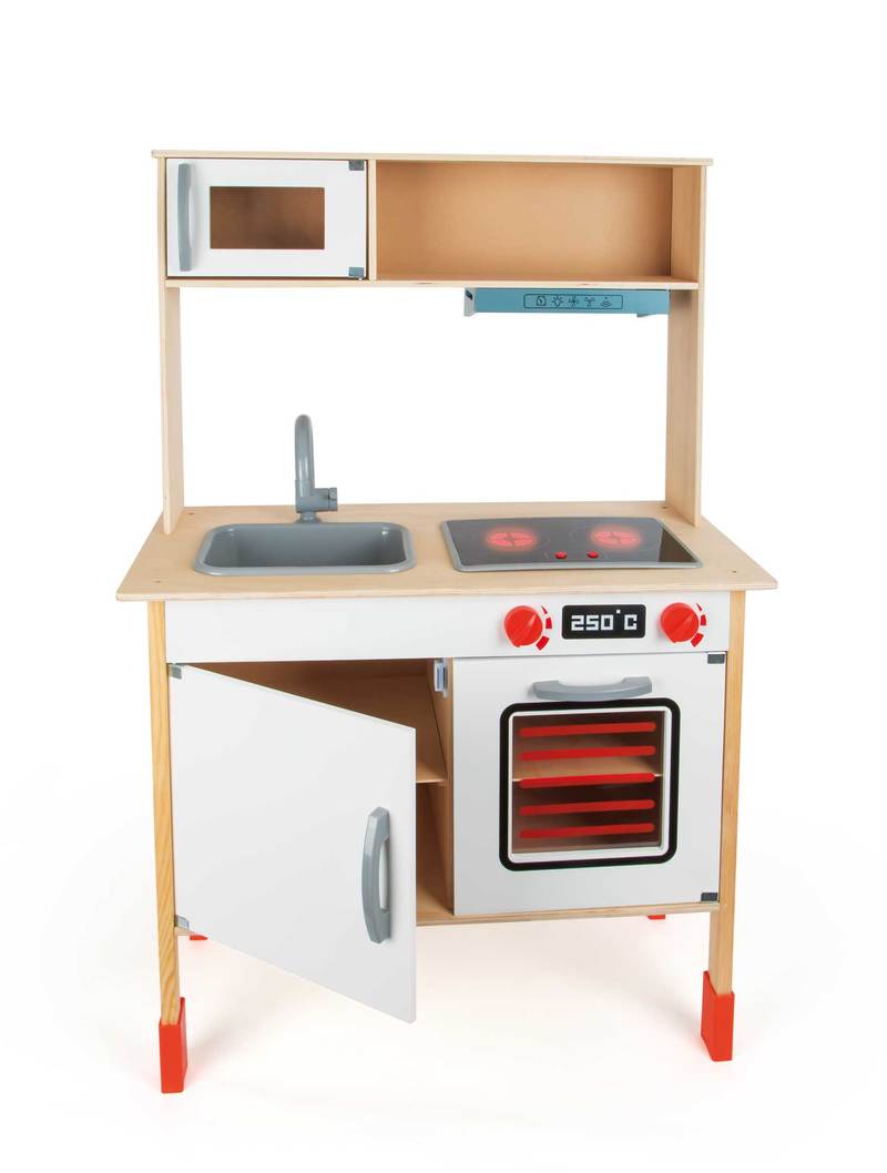 I´m cooking today! This play kitchen with many different playtime possibilities is loads of fun. The legs are adjustable for height, and the kitchen is made of stable laminated wood. Batteries not included. Small details like the sink with the interactive faucet, the stove range that lights up when a button is pressed, the oven with rotatable knobs, and the small range hood offer lots of playtime fun. Behind the cabinet doors, there's lots of space for everything that young chefs need. Whether for fantasy-filled playtime alone or with other children, this modern play kitchen is a must-have for the children's room!