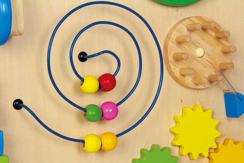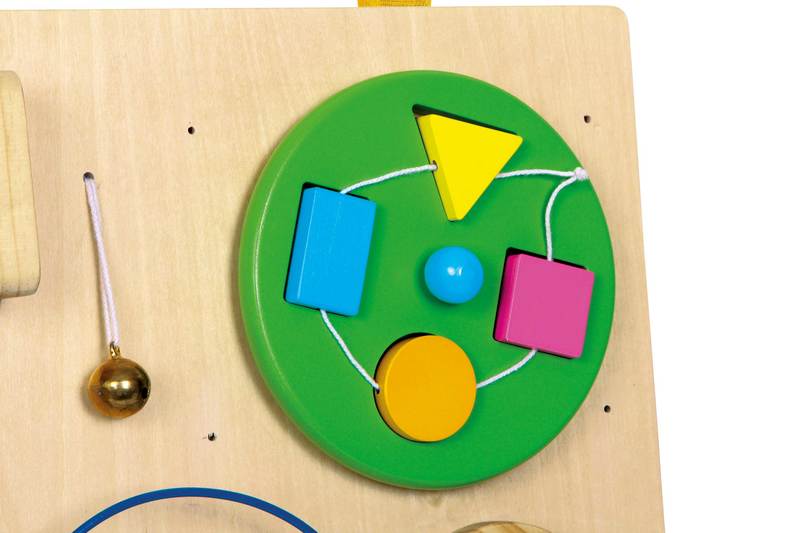 Train the fine motor skills of the fingers playfully and with pleasure. A perfect toy with eight features! Move the wooden beads on the small abacus, strike the xylophone making sonorous tones, move the wooden beads on the metal spiral or find the correct place for the geometric shapes on the rotatable disc. Rotate the five gears on the handle, which will make every little hand excited! The pivoting supports will ensure a safe stand. A combination of sturdy plywood and brightly painted solid wood parts will please the youngest members of the family!