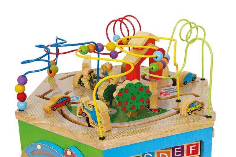 Off we go on an expedition! This colourful wooden motor activity cube offers all kinds of play possibilities on seven sides. In addition to the bead rollercoaster, puzzle, labyrinth, and push-button games, young children can simultaneously learn the alphabet and deepen their understanding of numbers. This finely-detailed play cube offers toddlers variety and guarantees hours of playtime. Boredom doesn't have a chance!