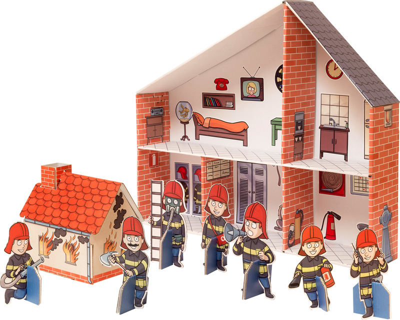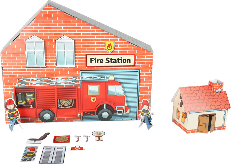 Wee-ooo, wee-ooo! All kids who love the fire brigade will love this cardboard fire station. It comes with numerous accessories, many arrangeable figurines, and even a burning house to be extinguished. Once it is quickly assembled and the interior stickers are put on, the fun can begin. The figurines depict typical worktime situations and routines of firemen, and invite kids to experience the adventures of recovery, rescue, and putting out fires. The colorfully printed cardboard building in fire station style is guaranteed to be a hit with adventurous children!