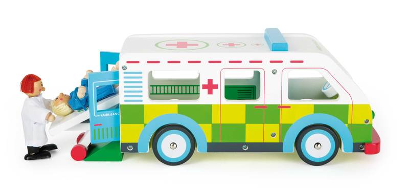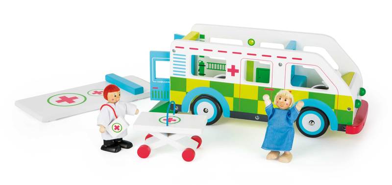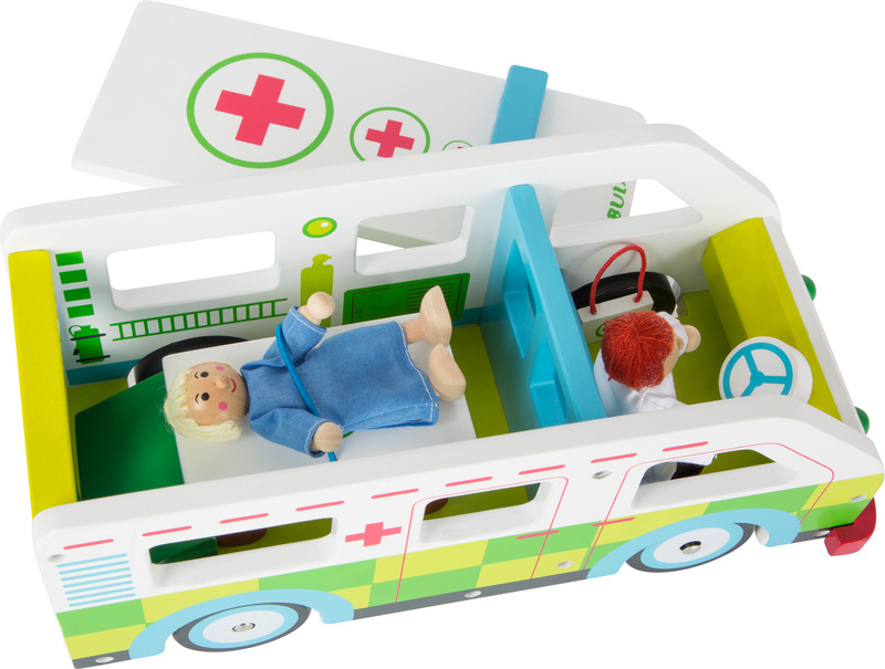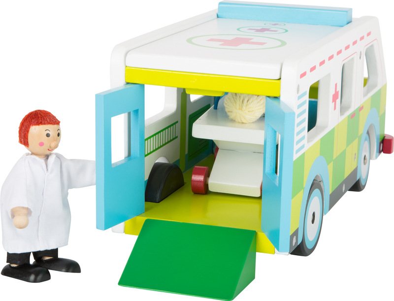Beep beep, here comes the ambulance! This emergency vehicles made of stable wood has a great level of playability due to its removable room and the hinged doors on the back. Now every child can be a paramedic in their own children's room. The doctor speeds to the next location in this compact wooden ambulance. All patients will feel safe on the rolling stretcher. The ambulance can also be played with from above with the removable roof. The magnetic ramp allows the stretcher to roll out nice and easy. Playtime fun is guaranteed here!