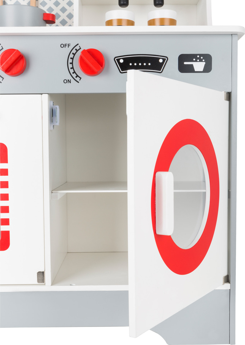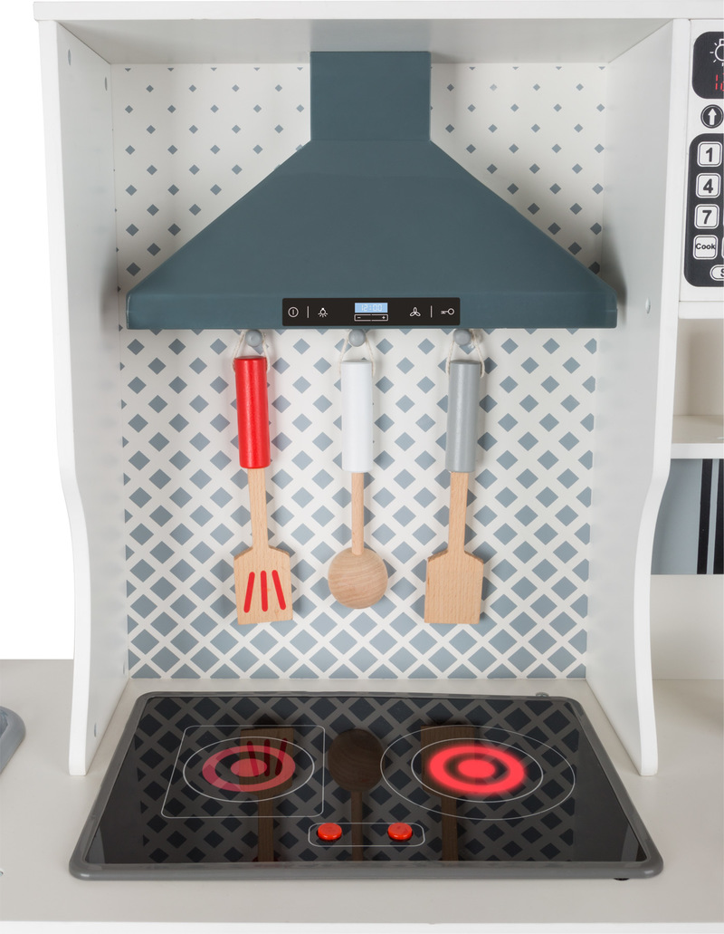 Who won´t feel the urge to cook here? With this diversely equipped play kitchen, every kid can be the master chef of the children´s room. This kitchen really imitates the real thing with integrated sound and light effects on the stove top and the various wooden cooking utensils. With a washing machine, an oven and a microwave, this kitchen has everything that belongs in a modern household. Batteries not included. This play kitchen offers so much space with its size that multiple children can play with it at the same time. And now: All master chefs to their stoves!
