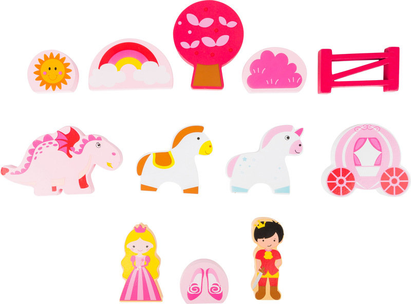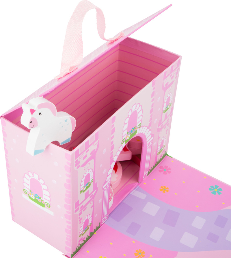An entire castle in one case! Simply open it up and Prince Charming will be able to save the princess. A unicorn and a horse with a magical carriage are also included and complete this robust cardboard set. It is securely lockable and comes with a handle, allowing it to be taken with you wherever you go. All figurines are made of FSC? 100%-certified wood. Enchanting playtime fun for on-the-go.