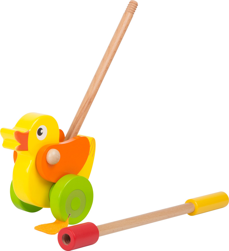 Quack, quack! Make way for the silly duck! When pushed and pulled, she wiggles her rubber feet and happily flaps her wings. A wonderful companion for a child's first steps. This push-along duck is manufactured from stable wood and is a great toy for the children's room. Balance and coordination can be playfully trained here. The handy pole offers children solid control over the duck as they push him through the room. Off they go to the next duck pond!