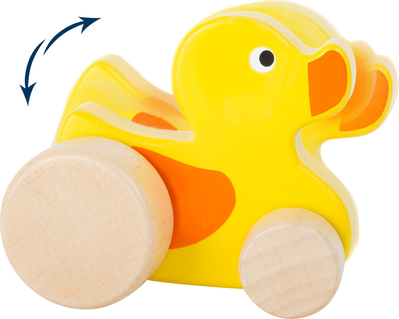 Quack, quack! There's going to be lots of movement in the children's room with this silly duck made of beautifully shaped, FSC? 100%-certified wood. The large rear wheels make the duck's little tail oscillate up and down. It's great playtime fun that simultaneously trains motor skills and movement abilities. Where will this duck waddle off to next?