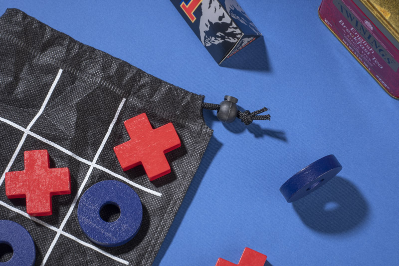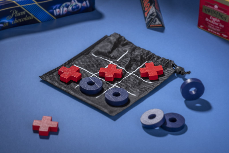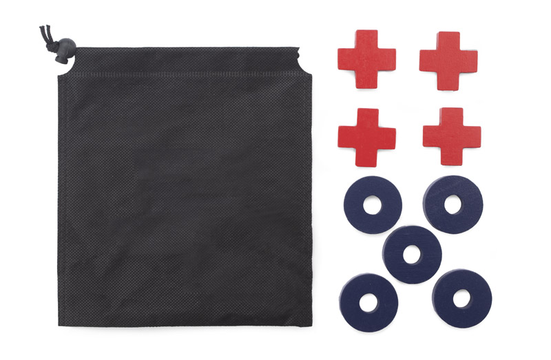 Tic-tac-toe is a well-know game played by two players. It is packed in a black bag with a printed board. A small product, perfect for taking on a trip.