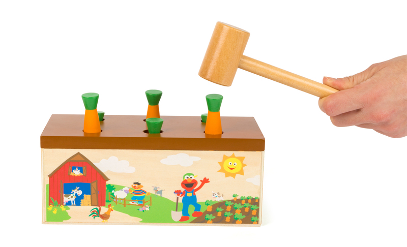 Who can help Grover and Elmo with their farm work? With the wooden hammer, the brightly coloured carrots can be hammered down - but be careful: where will they pop back up next? This hammering game is comprised of FSC? 100%-certified wood and playfully trains children's motor skills. With the square shape, this hammering bench has a strong footing and withstands the hammer strikes from the young ones.