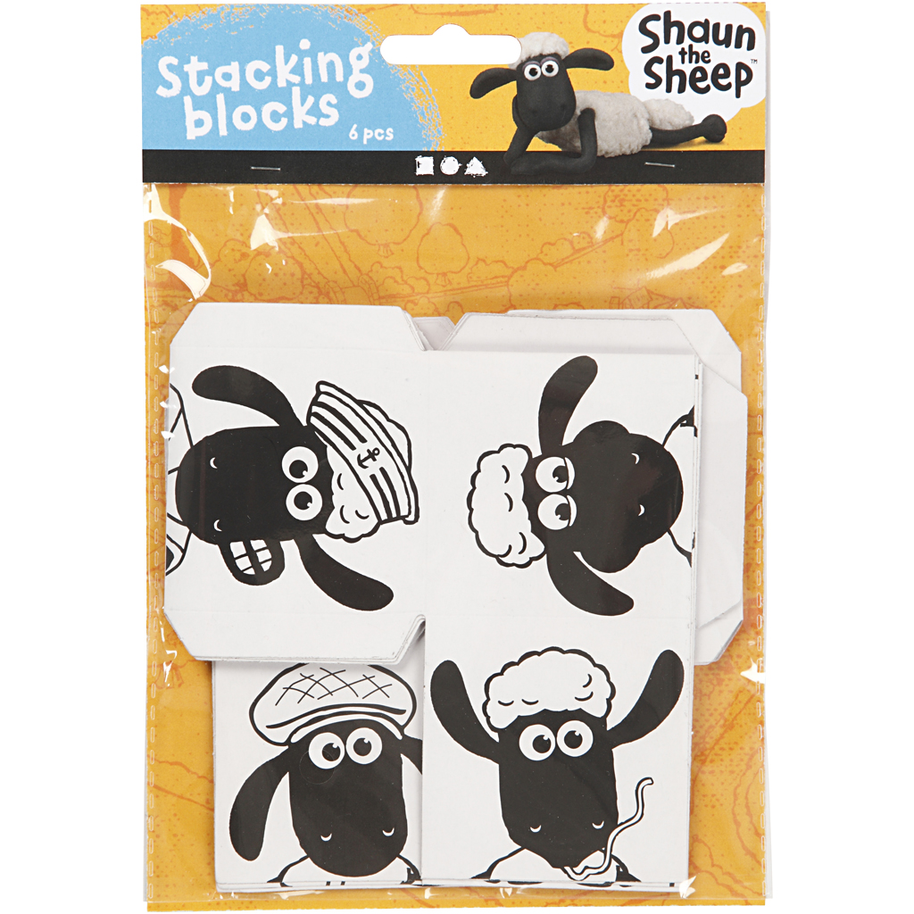 Heavy-duty cardboard stacking blocks with Shaun the Sheep pre-printed designs - 2 designs Lightly decorated with water-based marker. Stacking blocks, 2 pc/ 1 pack