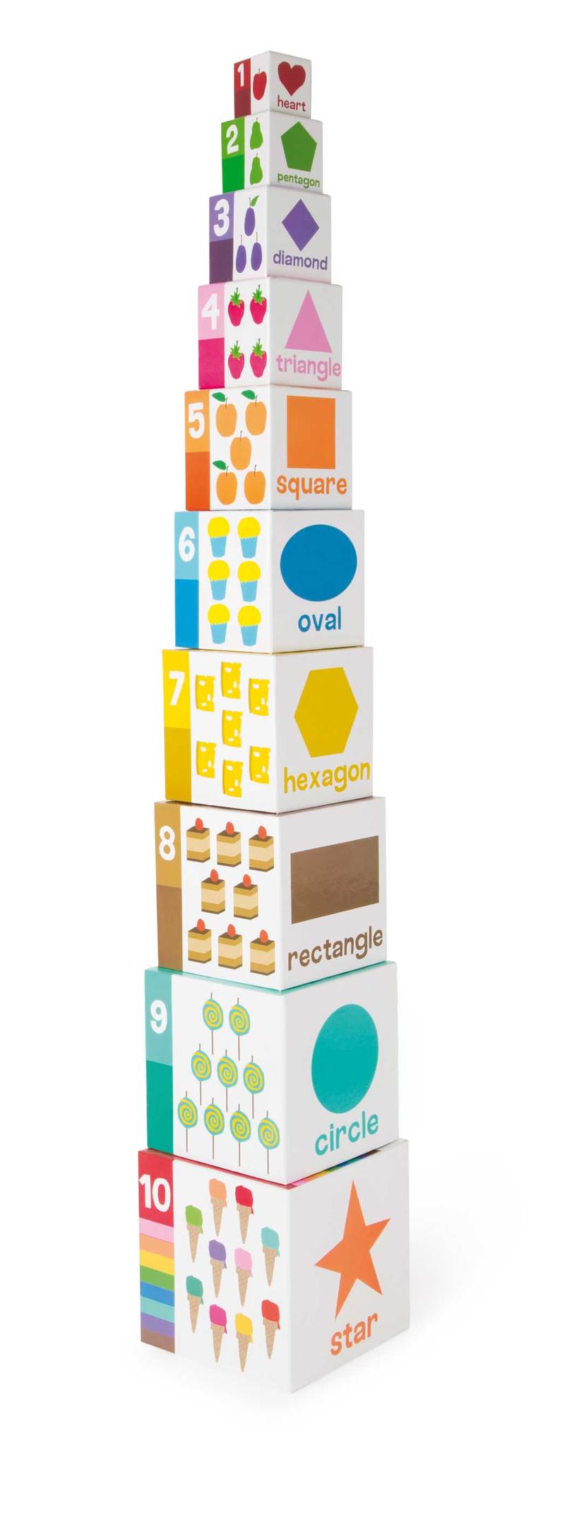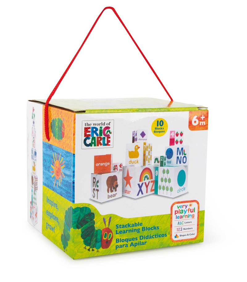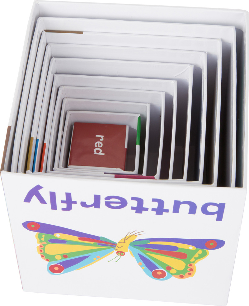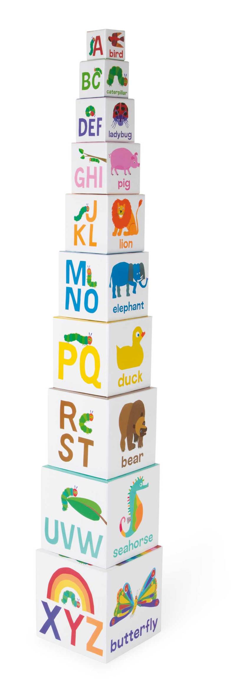 These Very Hungry Caterpillar stacking cubes made of stable cardboard are aiming for the stars. Ten cardboard cubes in sizes ranging from small to big can reach a height of 87 cm when stacked on top of one another - and there's something to discover on every side of every cube!