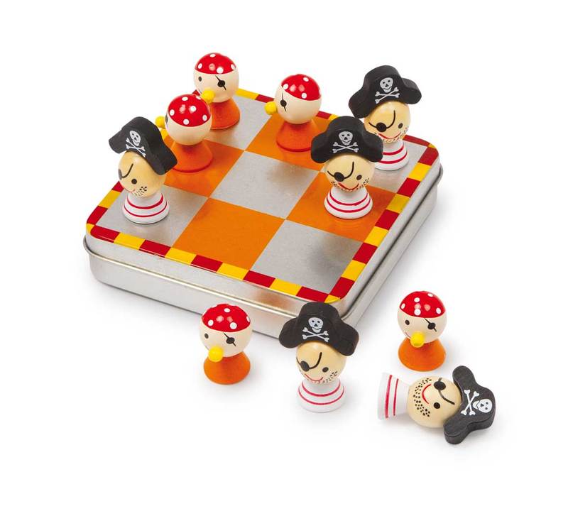 Pirate fun for big and small! The little magnetic wooden pirates stay the course on the practical metal box even in rough seas! This convenient tic tac toe game board also serves as the storage box for the game pieces. And while playing, this game playfully trains logical thinking and eliminates boredom. It's the perfect way to pass the time when on the go.