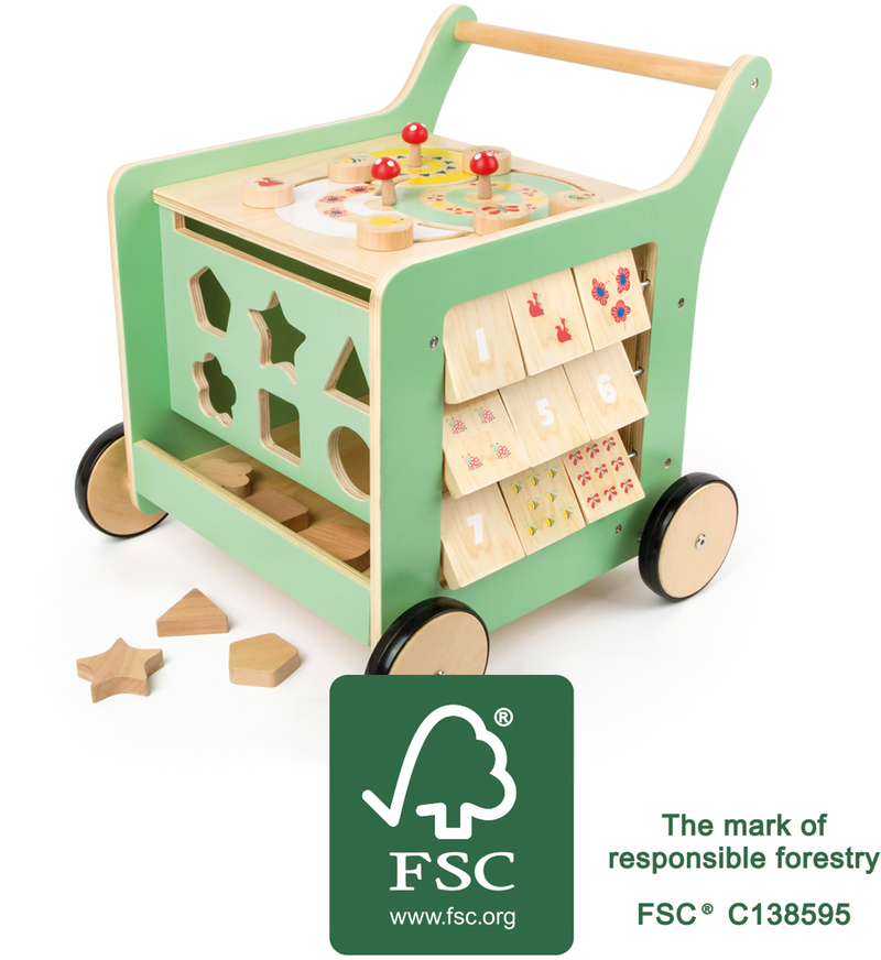 This baby walker made of FSC? 100%-certified wood is a real allrounder with its functions and its minimalist design. Here, you can spin, fit pieces, and draw. The top board can be raised up and offers lots of storage space inside for other toys. Thanks to the brake system, nothing can go wrong while learning to walk. With an integrated axle. Please note that this product previously had the product number 10455