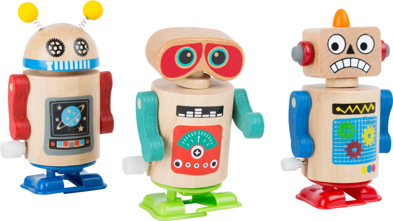 Set of 12. Attention, the robots are loose! These fun, colorful fellows made of FSC? 100%-certified wood go their own way after they're wound up. The arms can move and are attached to the wooden body with rubber bands. Each of the three wooden figurines is printed with their own individual pattern. No two are alike. No kid can resist these cute robots! Get your own attractive sales display for your store.