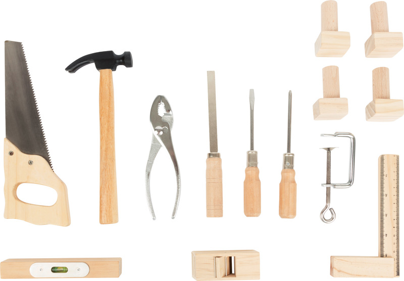 Bang, bang, bang – who’s that hammering? Young artisans copy the older ones and work hard crafting their masterpiece!  The workbench made of solid wood opens up a host of options for children and playfully promotes their creativity. Practical: With hammer, vice, screwdriver, saw, pliers, rule and level, the set already contains a wide range of accessories for right and left-handed users. Let’s go - what shall we build first?