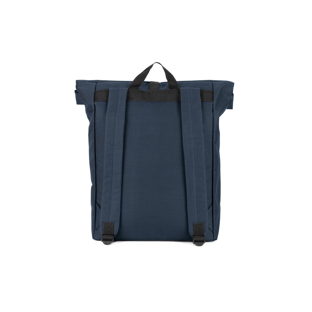 600D laptop backpack with 210D lining. It has a spacious main compartment for a laptop up to 17'3’, with a roll-top closure. Front zip pocket. Capacity to 21 L. 320 x 440 x 130 mm