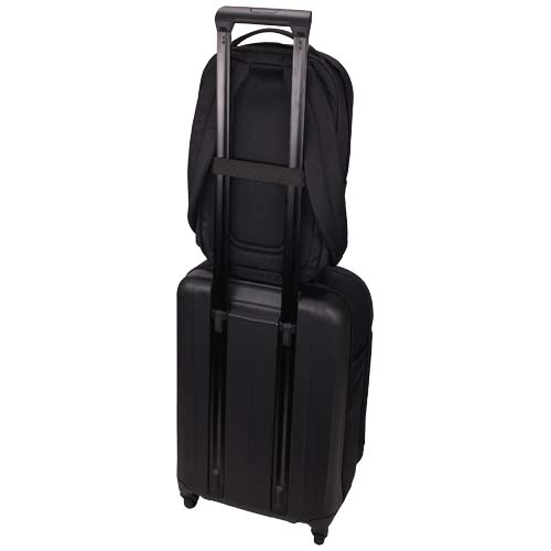 The Case Logic Invigo 14" laptop backpack is a simple and refined backpack made of recycled materials with thoughtful organisational features. It is made with a 100% recycled 600D polyester exterior and 150D polyester lining. The padded laptop compartment protects a 14'' laptop and the tablet sleeve can hold a 10.9'' tablet. Inside the backpack there are slip pockets to store small accessories, and a zipped mesh pocket providing additional secure storage for small items such as keys. At the exterior of the backpack there is a hidden back panel security pocket that keeps vital items like passport or wallet hidden yet close at hand. The front pocket provides quick storage of items while on-the-go, and the 2 side pockets are suitable for water bottles or an umbrella. The backpack also features a luggage pass-through strap to attach the bag to rolling luggage for effortless travel.