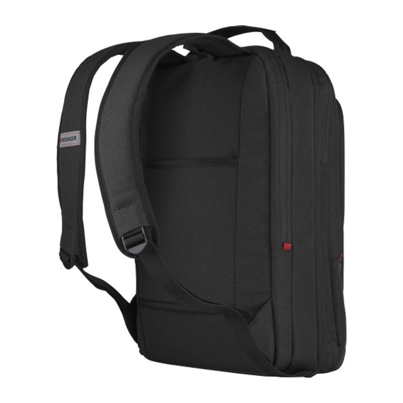 Backpack with padded compartment for 16" laptop and 12" tablet. Doubles as an overnighter, thanks to expandable main packing compartment. Contains mesh curtain that folds down to function as a regular backpack, essentials organizer, two front QuickAccess pockets with coated, ater resistant zippers, file divider, trolley Pass-Thru for mounting the backpack on the telescopic handle of a suitcase, and a reflective lash point.