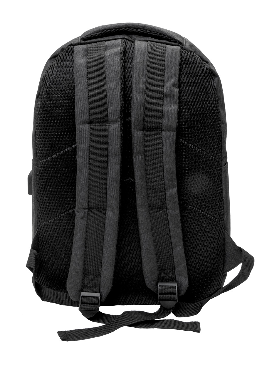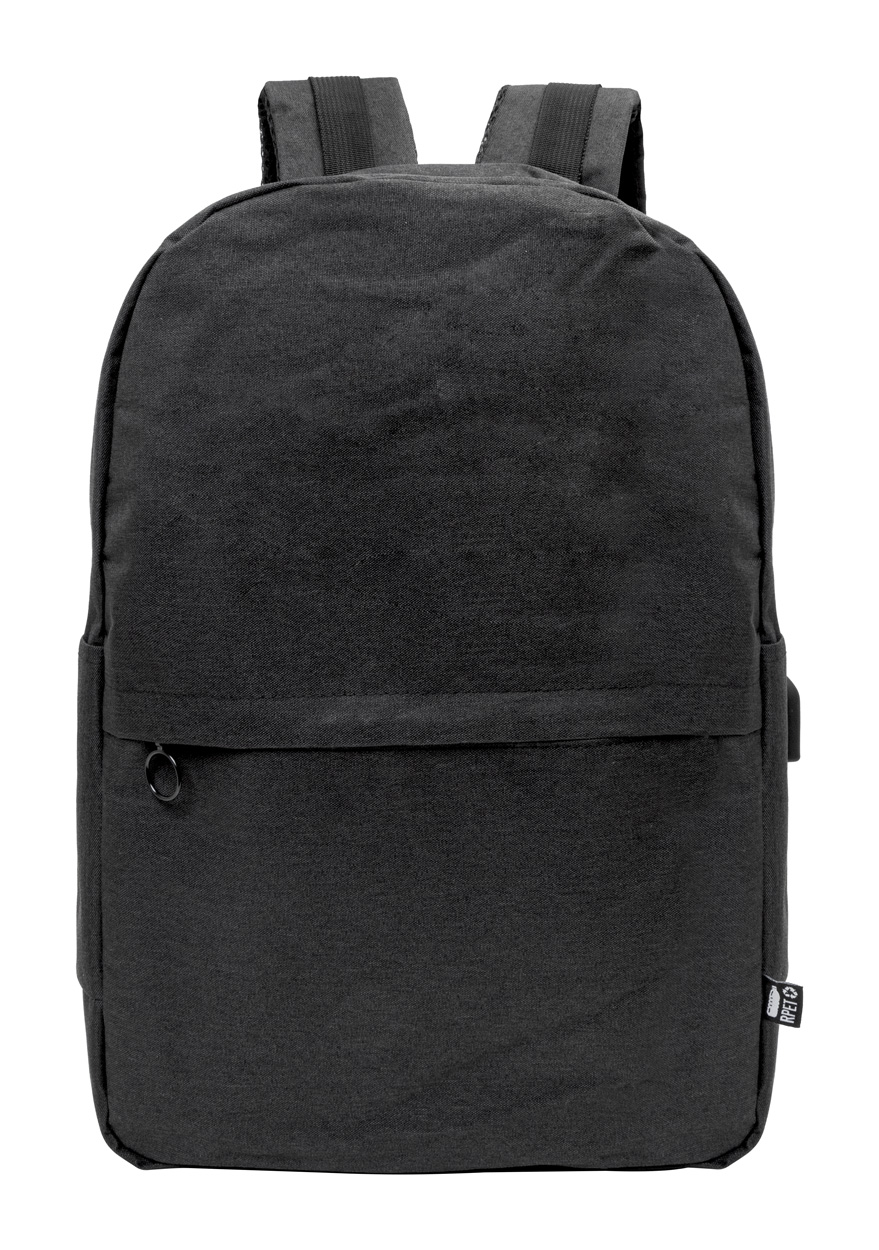 Backpack with zipped compartments, padded laptop (15") and tablet (10") compartment, padded back and shoulder straps. With distinctive RPET label and built-in USB connection for power banks. 600D RPET polyester.