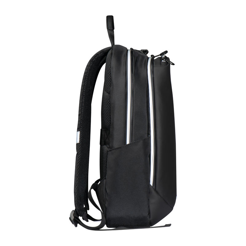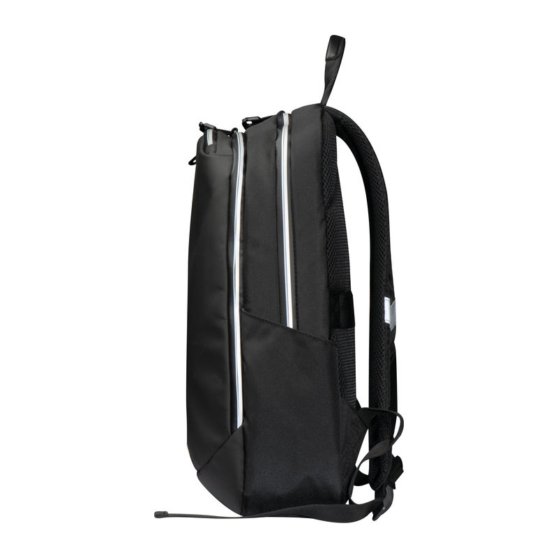 Waterproof, trolley-compatible laptop backpack crafted from 1,200D nylon for 15.6" laptops, featuring reflective zips, a spacious interior with multiple compartments, and a reflective safety strip on the front.