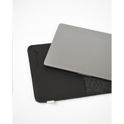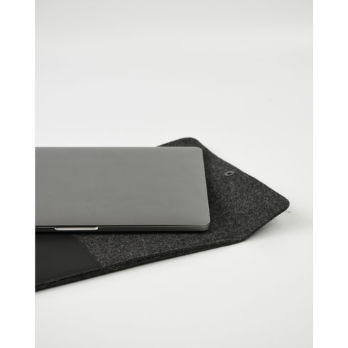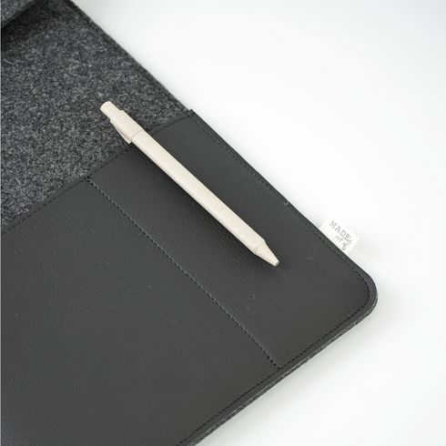 A simple but stylish 14-inch laptop sleeve made from recycled wool felt and vegan leather. A product from the MADE out of brand. The wool felt is made from 50% recycled content, 30% wool and 20% PE. The sleeve has a flap with a press stud closure and features 2 pockets on the front. These are made from beautiful vegan leather created from recycled apple pulp. It has the look and feel of real leather and gives the sleeve a luxurious look. Suitable for storing and safely transporting a laptop up to 14 inches. This top product is handmade. Dutch design. Made in Holland.