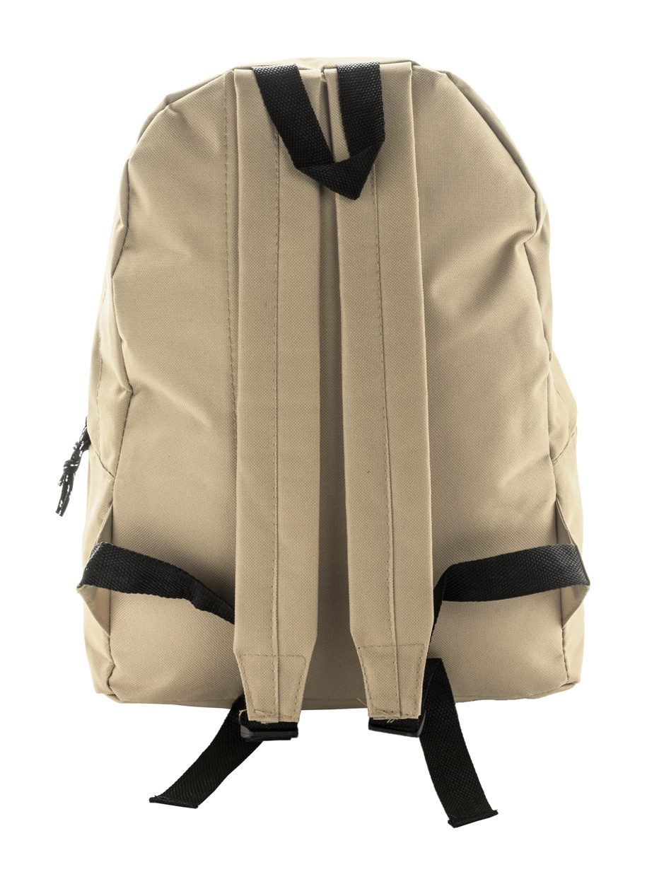 Backpack with zipped front pocket, padded back and shoulder straps. 600D polyester.