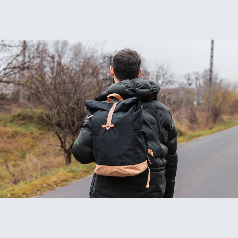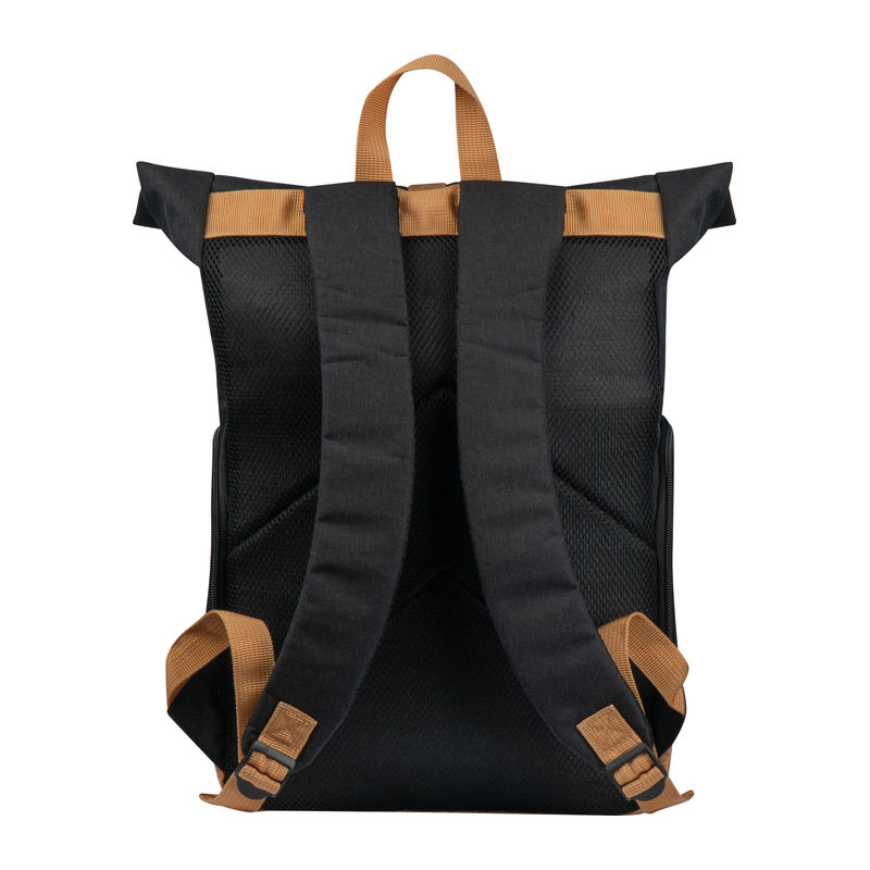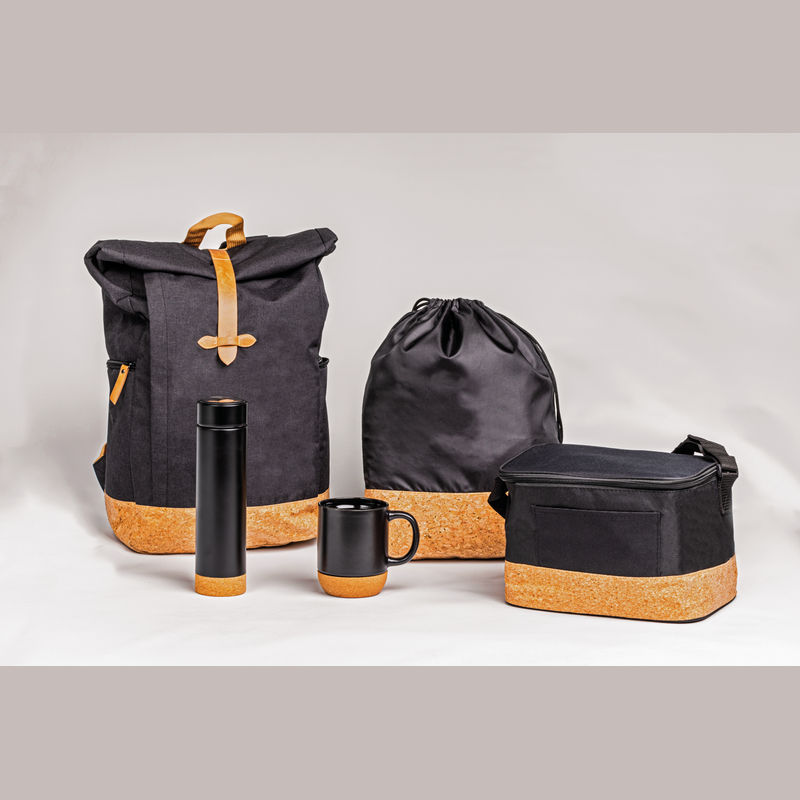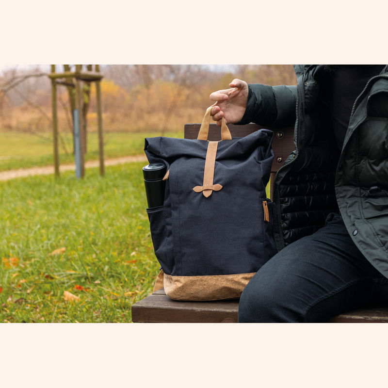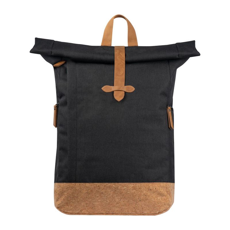 RPET backpack made of 300D two-tone polyester and 210D RPET with a lockable main compartment, two lockable side compartments and a filling capacity of 20 liters. Padded shoulder straps and cork bottom. Easy to close by rolling or folding. Your logo will be printed on the front.