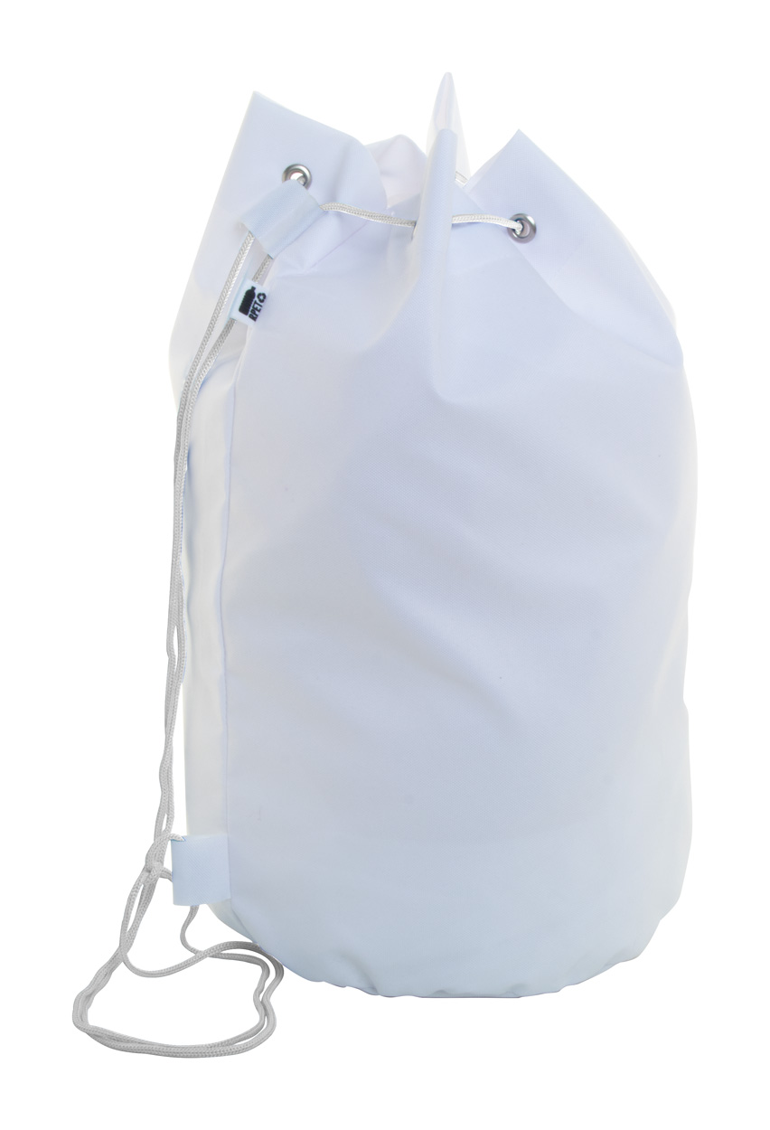 Custom made, drawstring sailor bag in 600D RPET polyester, with coloured strings. With all over sublimation printed graphics and distinctive RPET label. MOQ: 25 pcs.