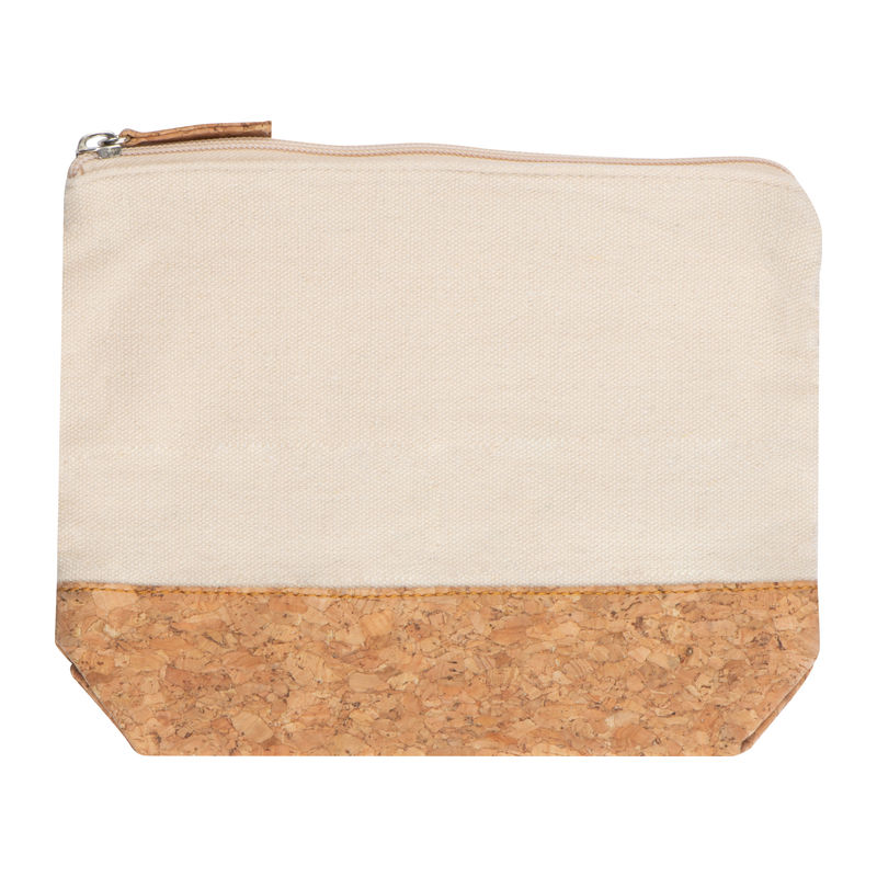 Cosmetic bag crafted from cotton, featuring a cork base and a secure zip closure.