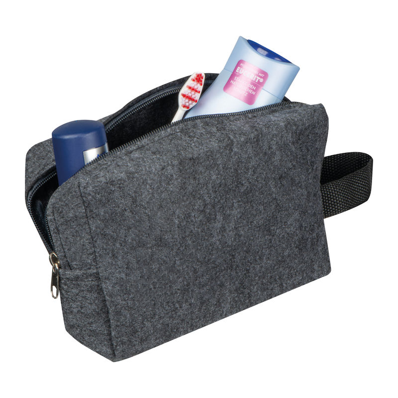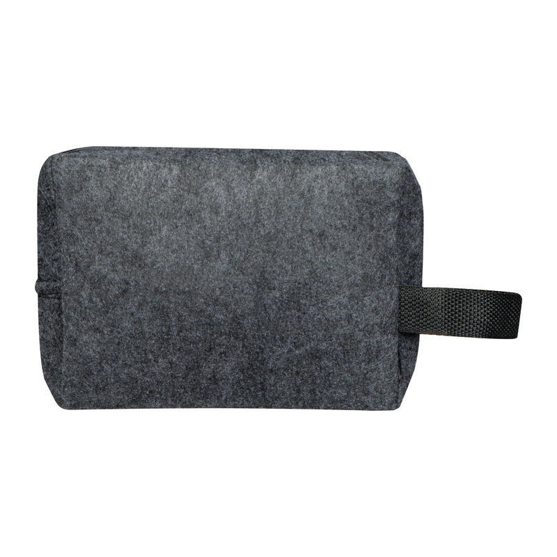 RPET felt cosmetic bag featuring a carrying loop. It includes a main compartment and an additional front compartment secured with a zipper.