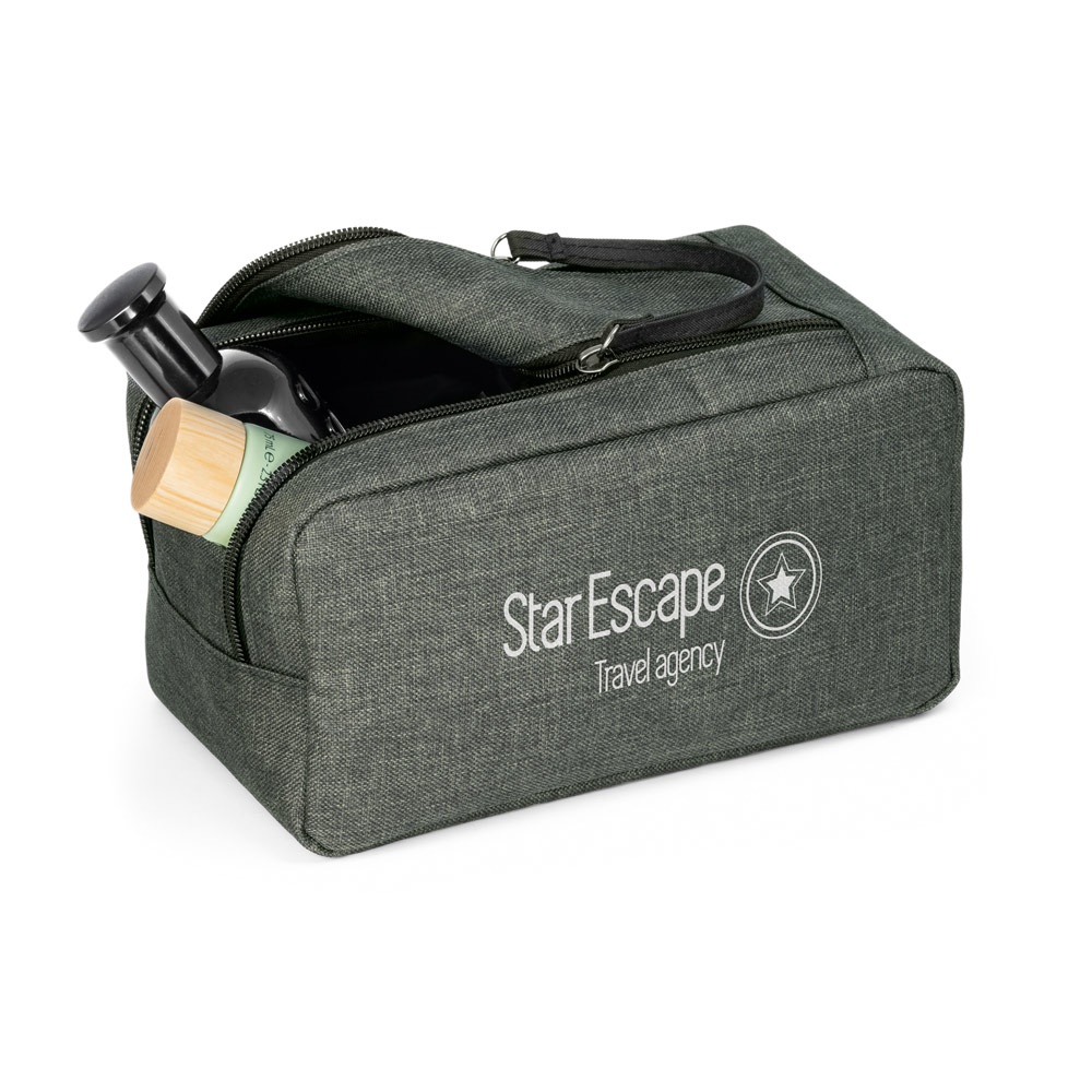 Toiletry bag in high density 600D with handle, double zipper and lined interior. 220 x 110 x 110 mm