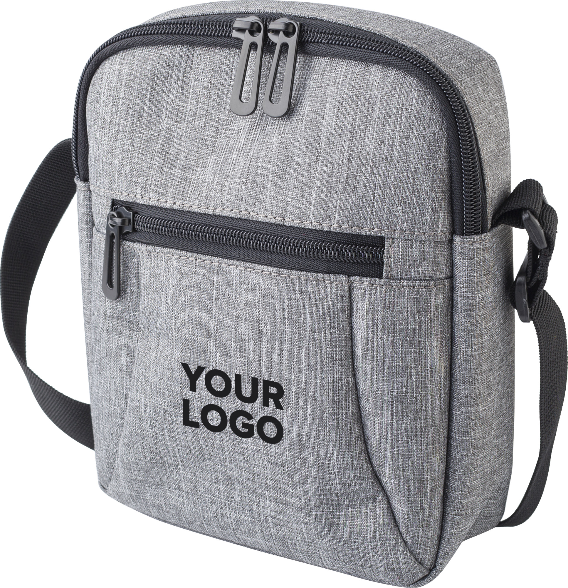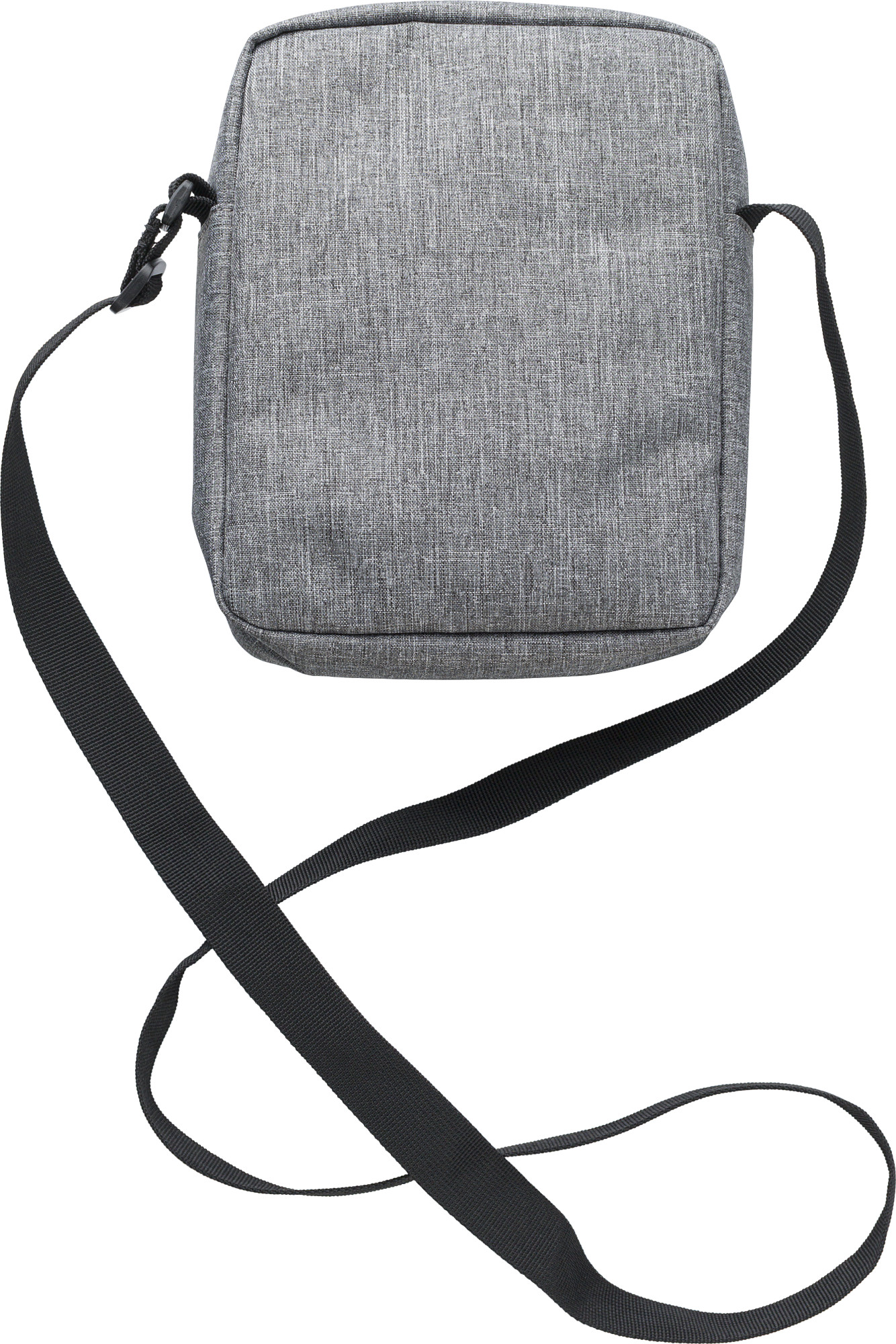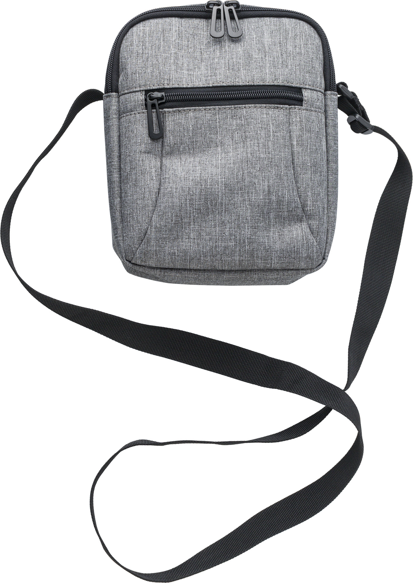 Polyester shoulder bag, small. Main compartment and front pocket with zipper and an interior pouch. Adjustable shoulder strap.