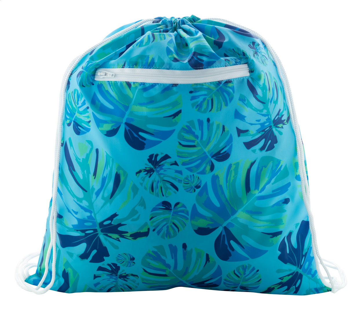 Custom made drawstring bag with zipped front pocket, 190T polyester. With all over sublimation printed graphics. MOQ: 25 pcs.