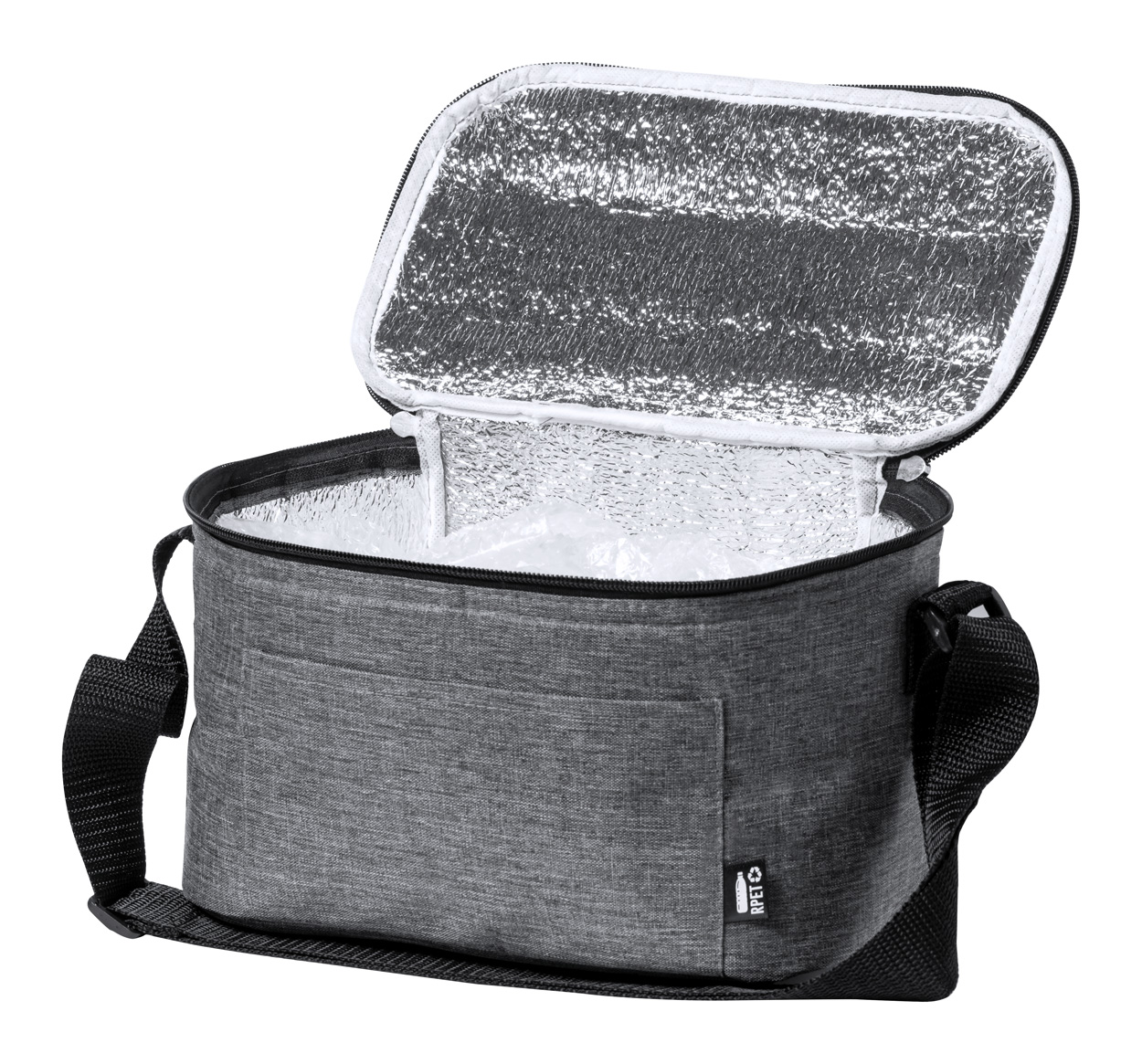Zipped cooler bag in RPET with aluminium padding, for 6 pcs 0,33 L cans. With front pocket and adjustable shoulder strap. 600D RPET polyester with distinctive RPET label.