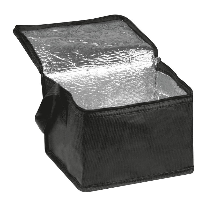 Non-woven cooler bag featuring a carrying strap, designed to accommodate six upright beverage cans (0.33 litres each).