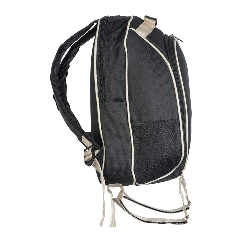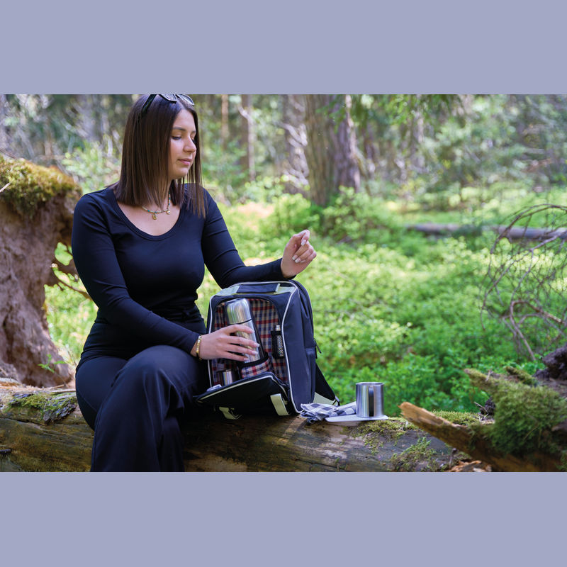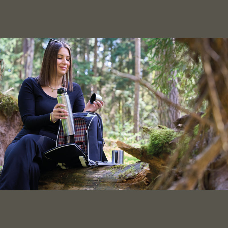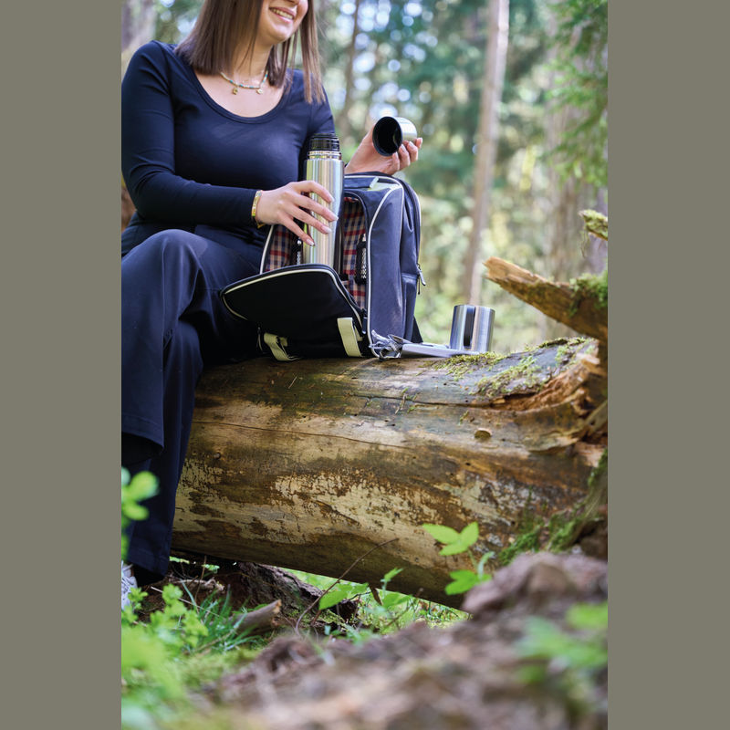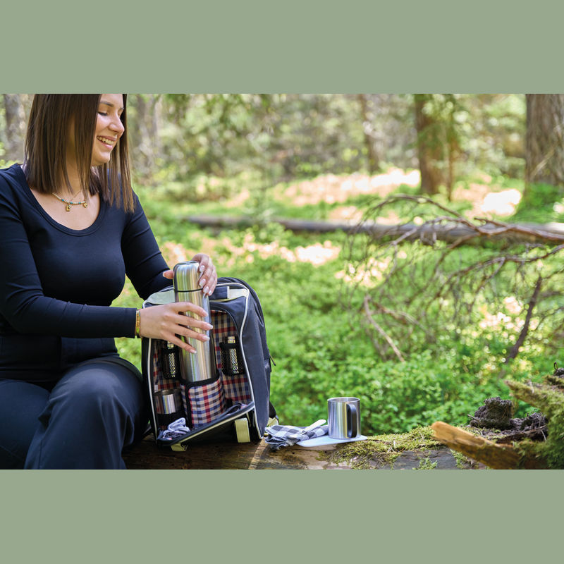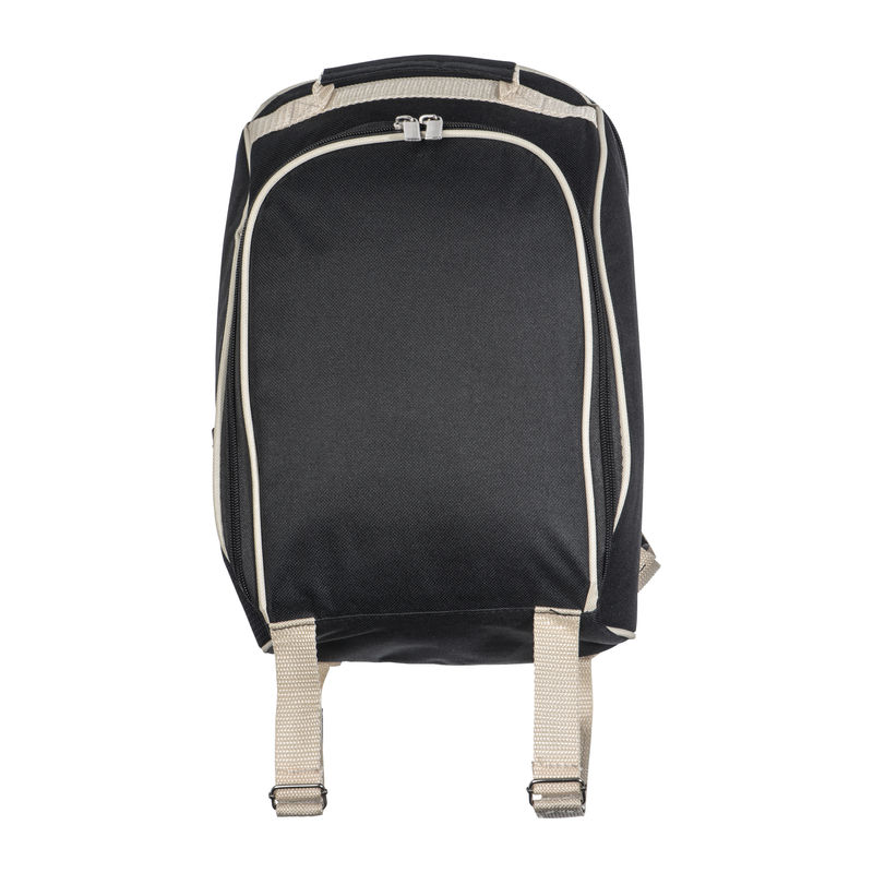 Luxurious picnic backpack crafted from high-quality, robust polyester. Its compact design is complemented by a cooling compartment at the rear and a spacious interior, featuring premium equipment including a 1-litre stainless steel insulated flask, two 0.2-litre stainless steel cups, stainless steel salt and pepper shakers, a snack tray, cutlery, and napkins.